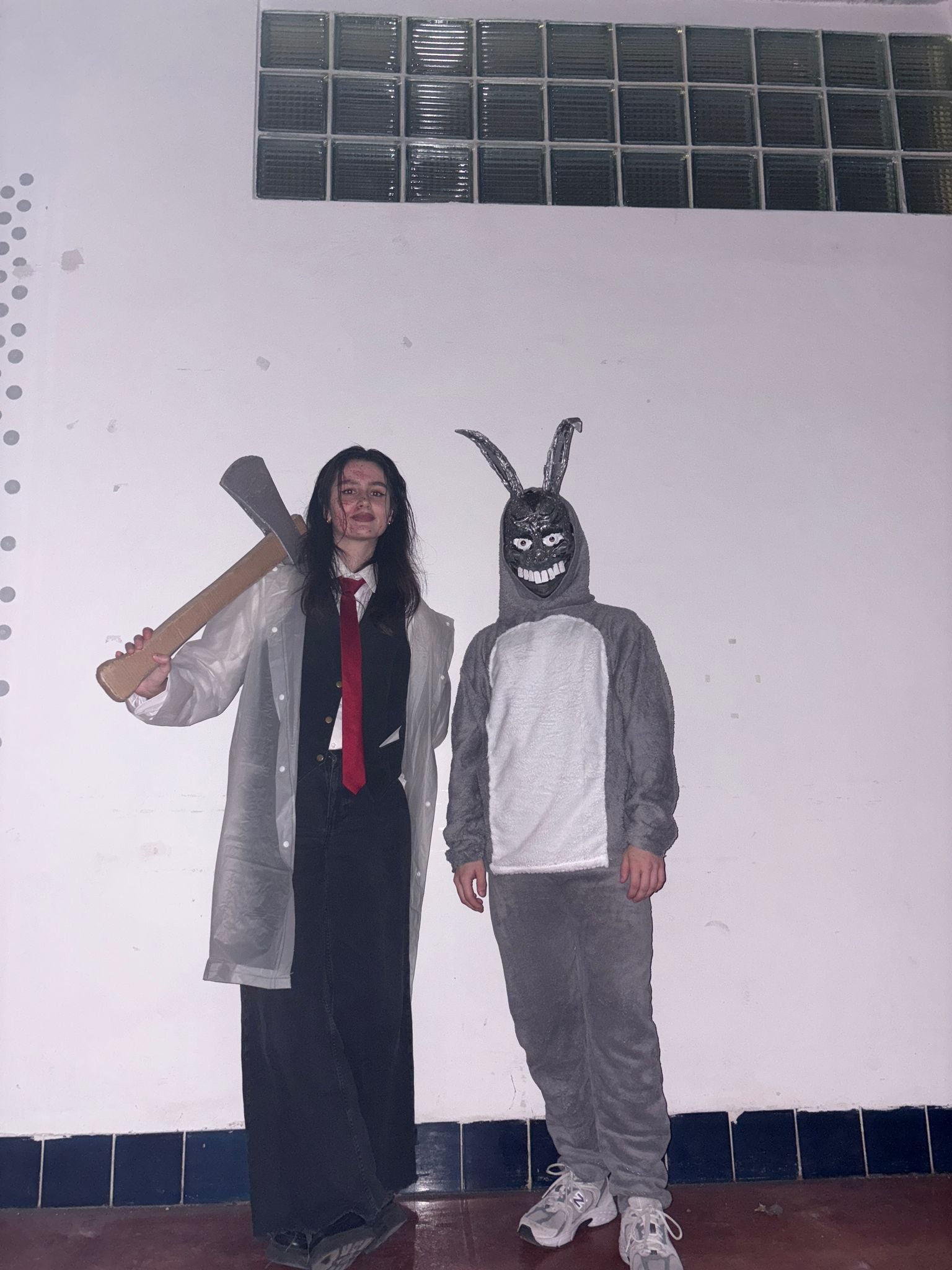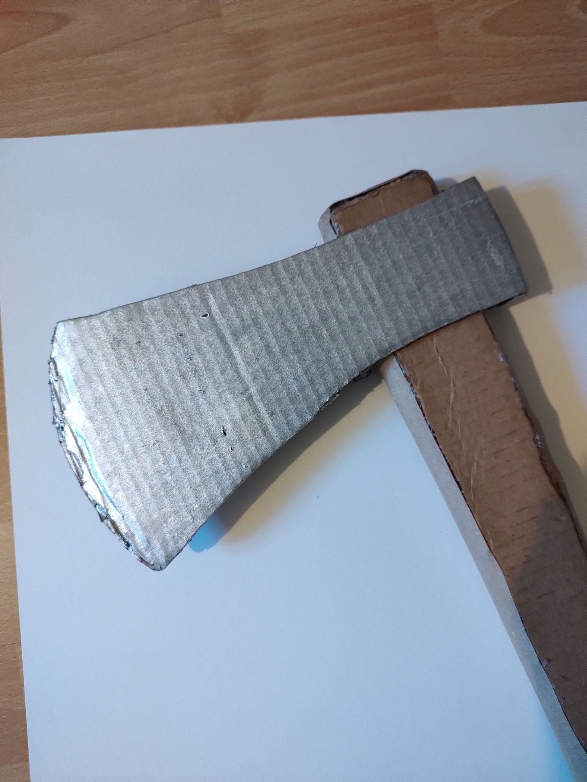 Sekera pre halloweenský kostým Patricka Batemana—ručne vyrobená z kartónu a farby v spreji.