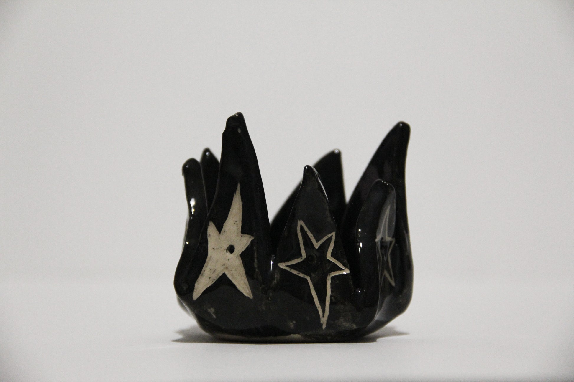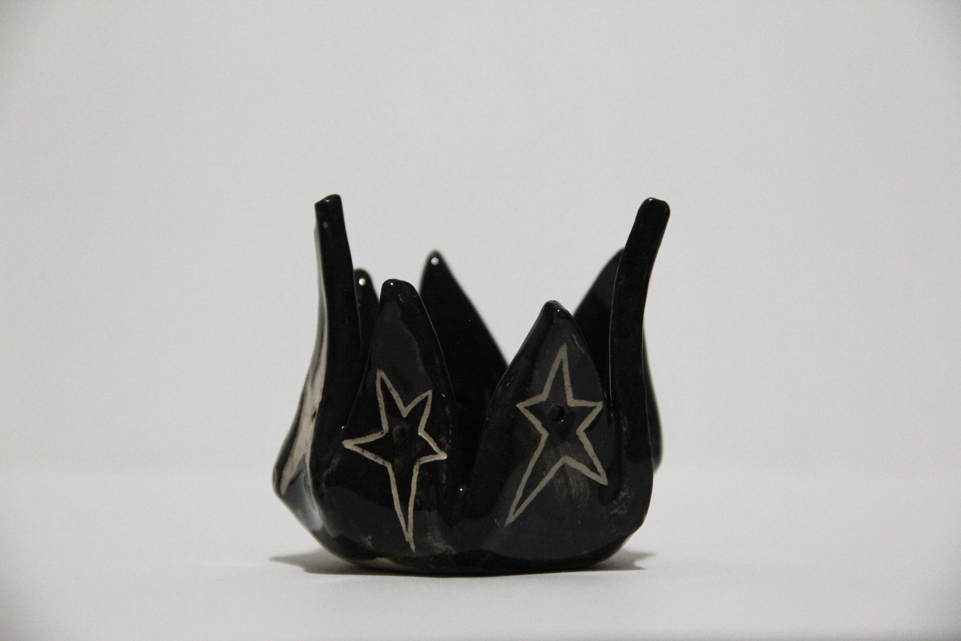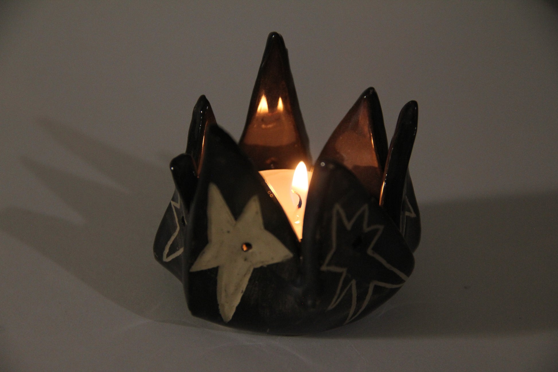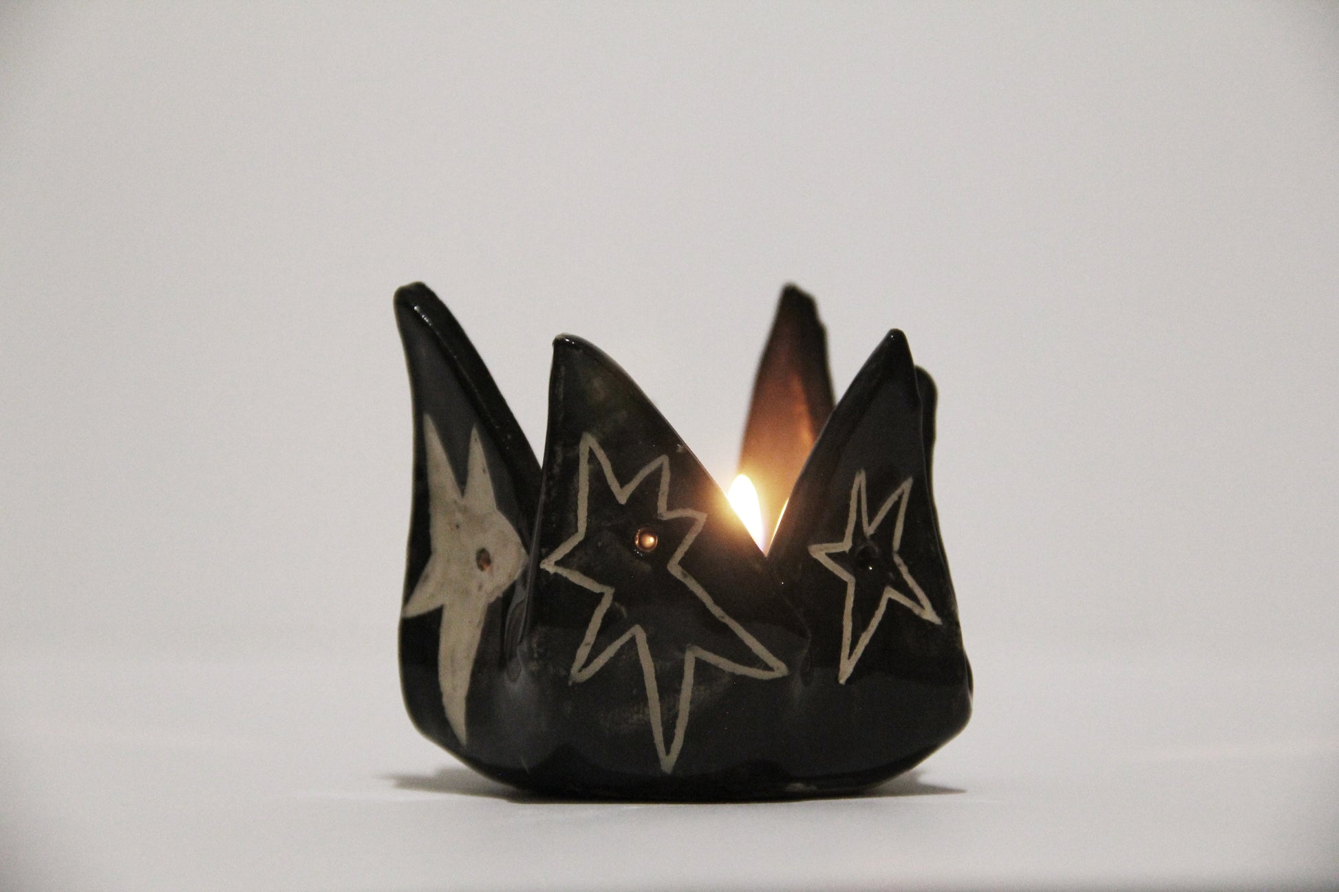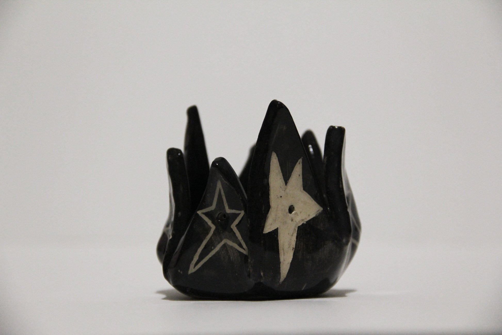 Ručne vyrobený čierny keramický svietnik s hviezdami. Keramika s hlinkou.
