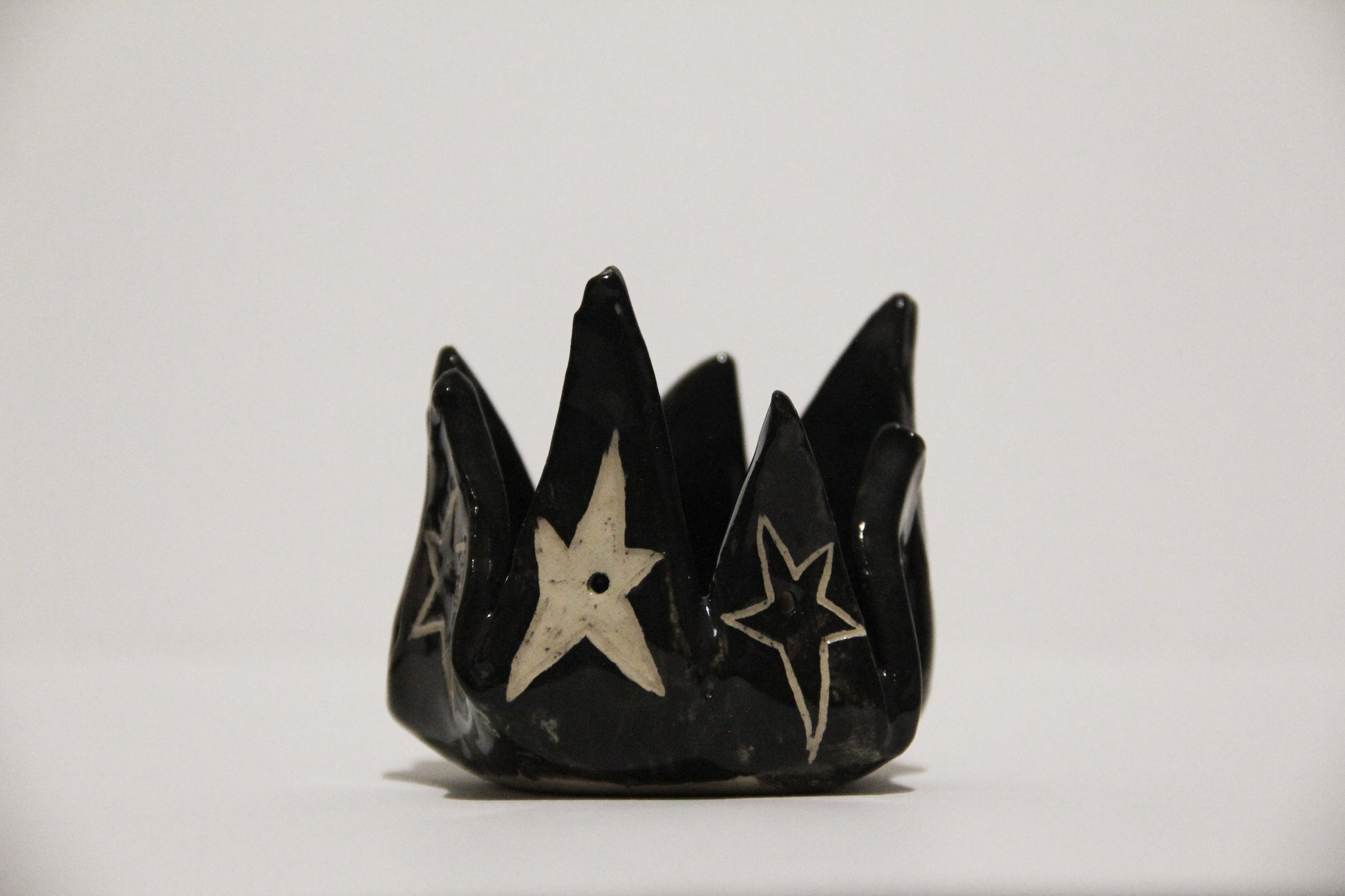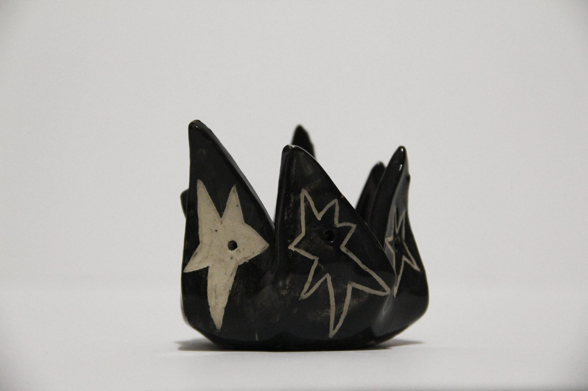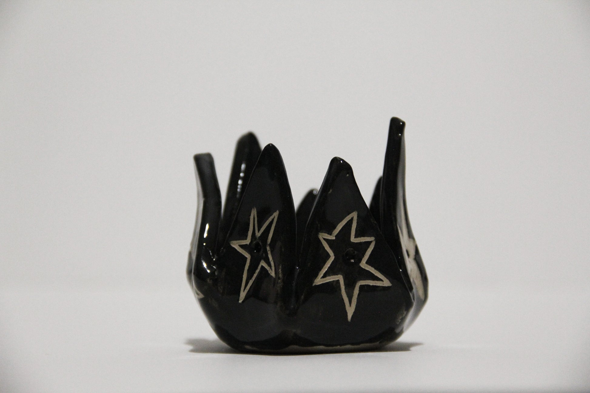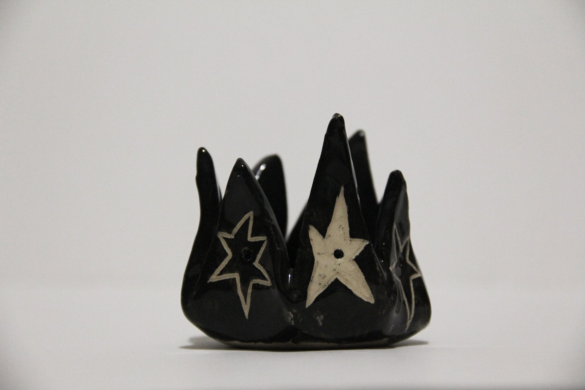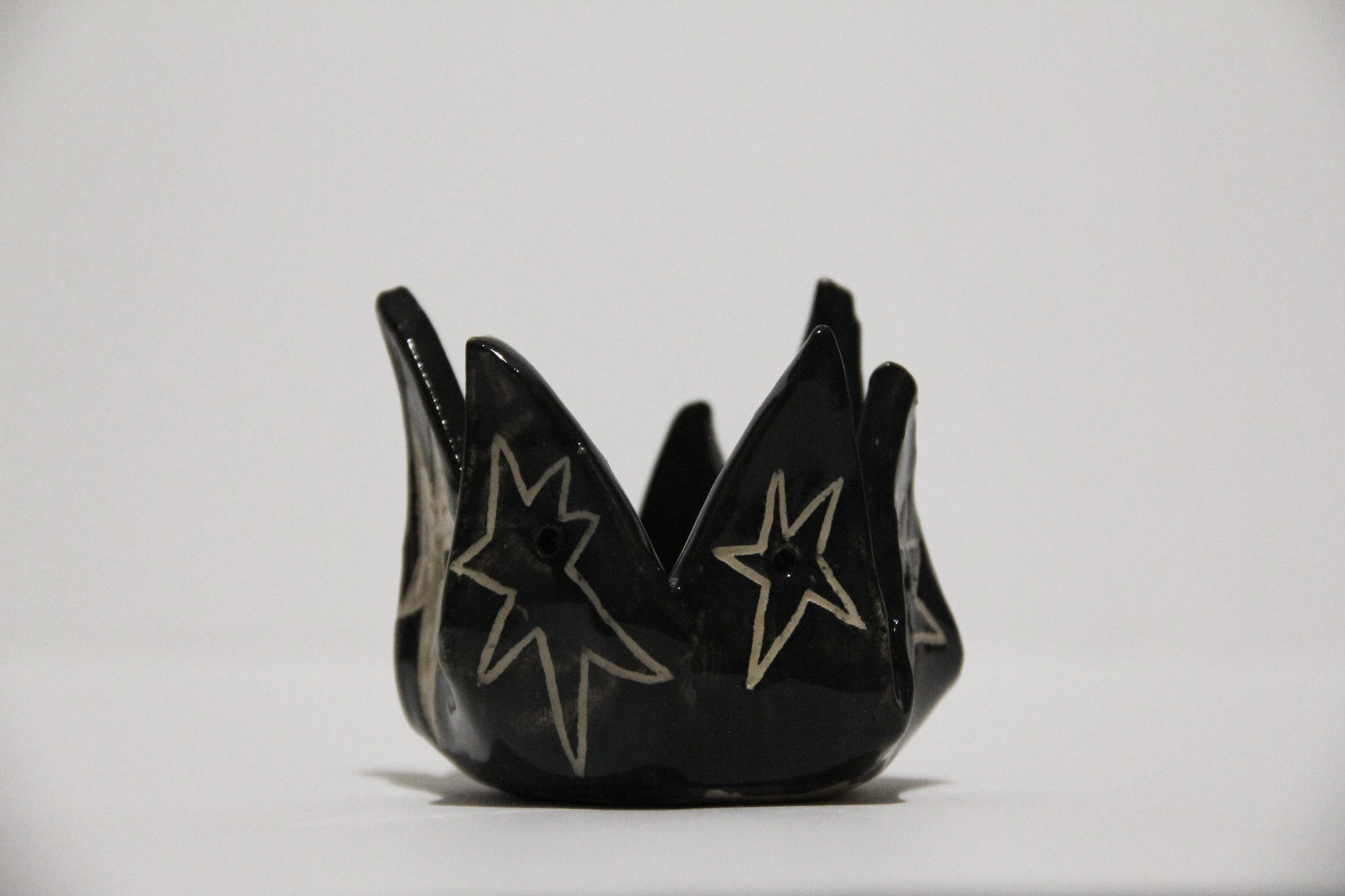 Ručne vyrobený čierny keramický svietnik s hviezdami. Keramika s hlinkou.