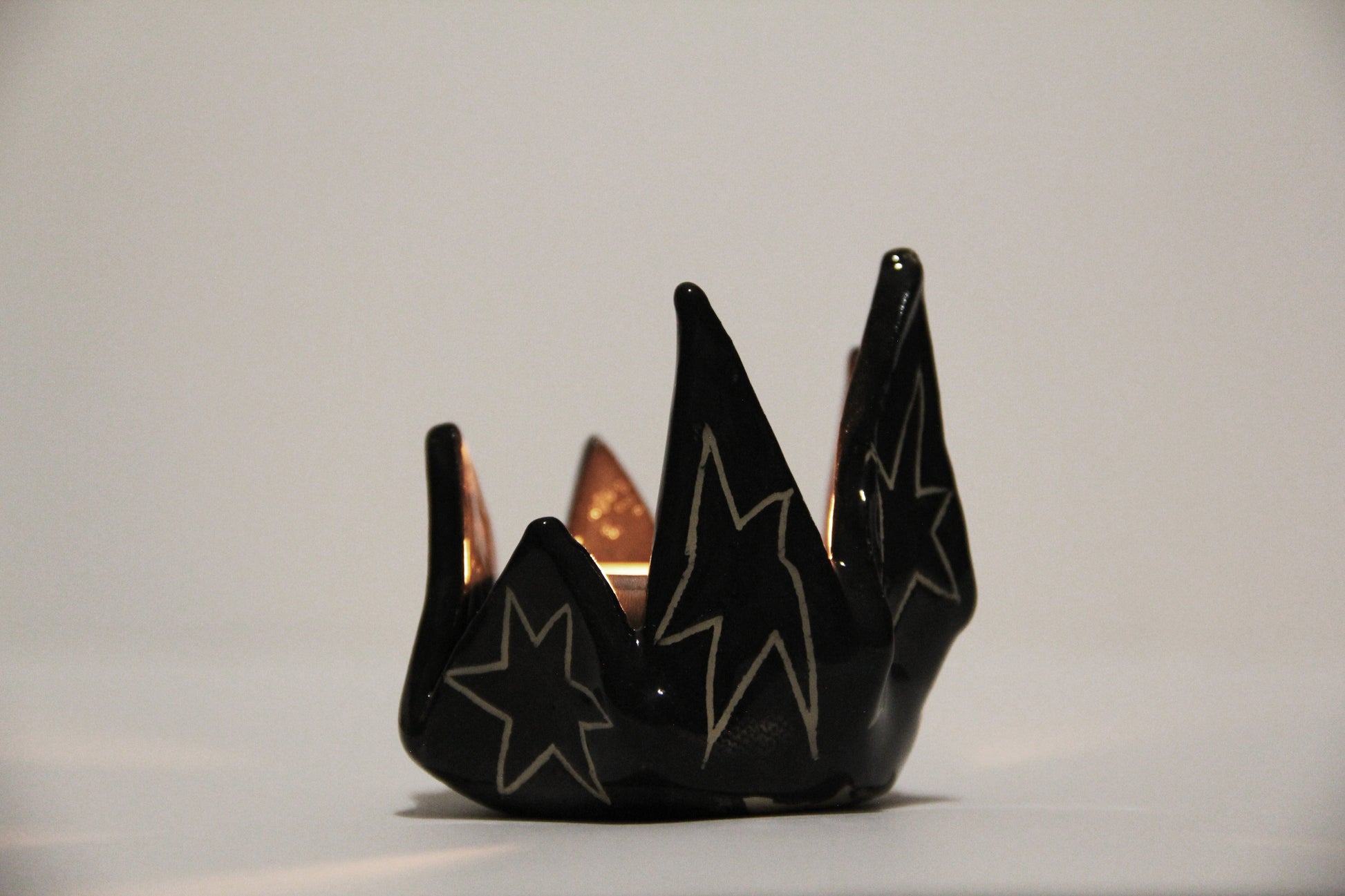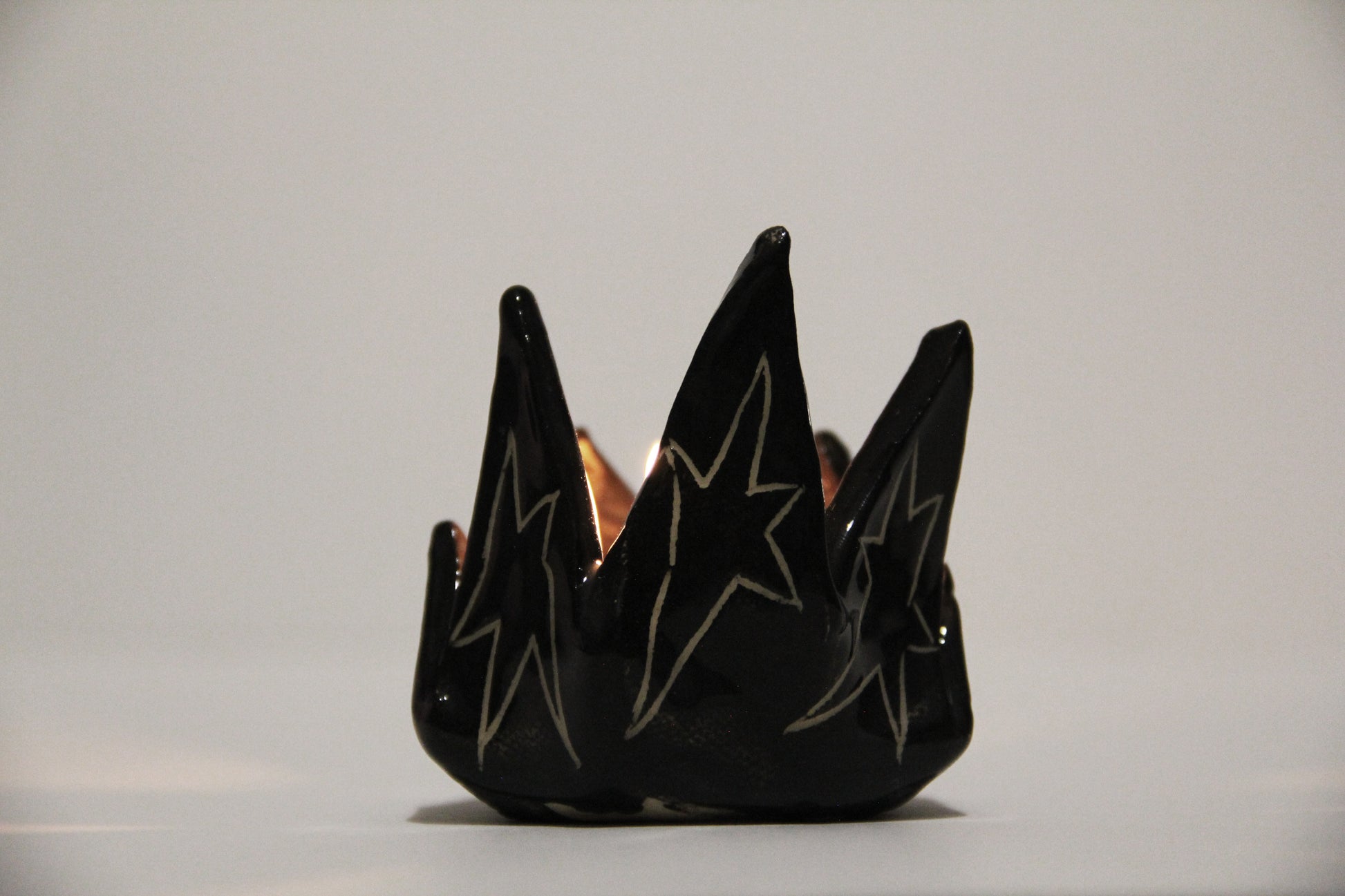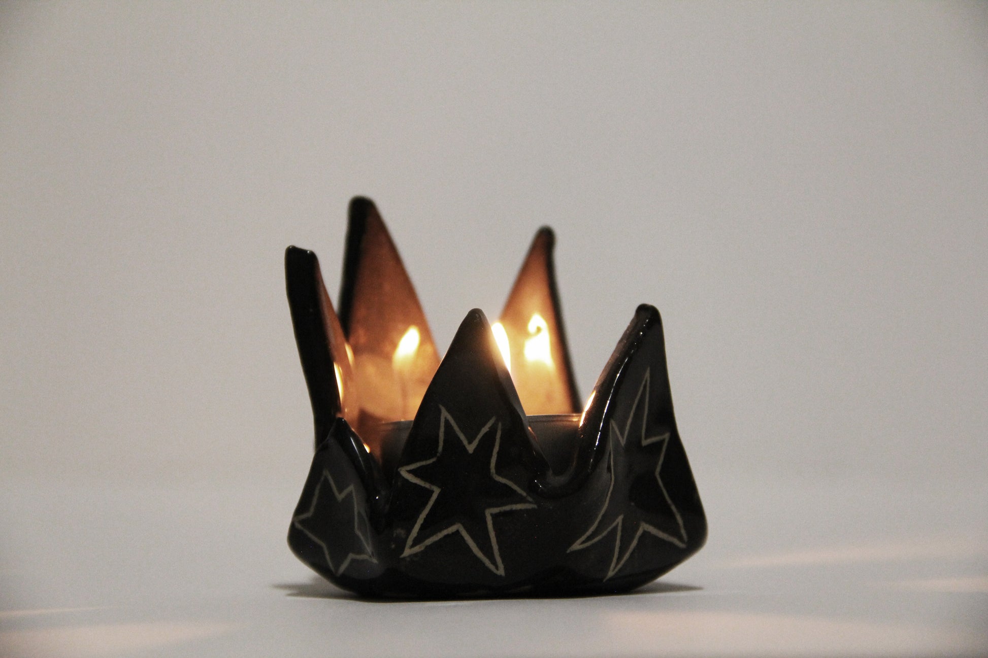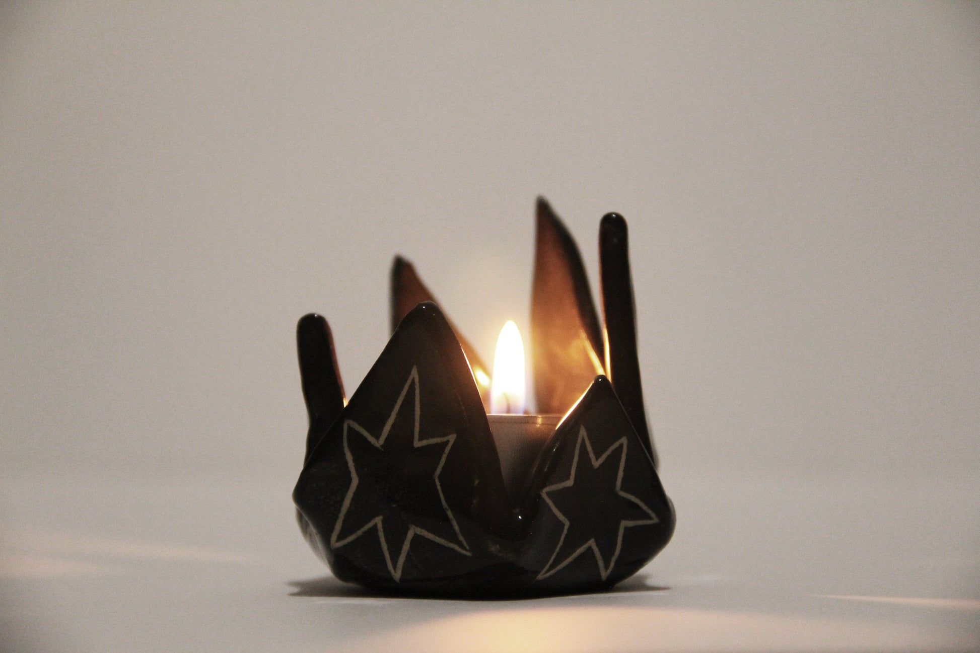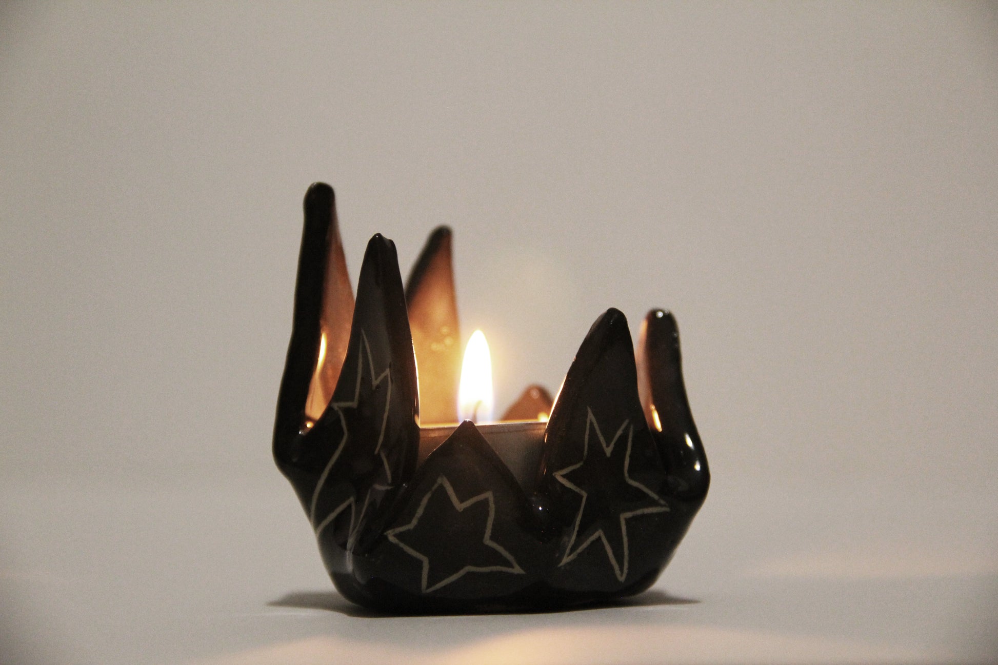 Ručne vyrobený čierny keramický svietnik s hviezdami. Keramika s hlinkou.