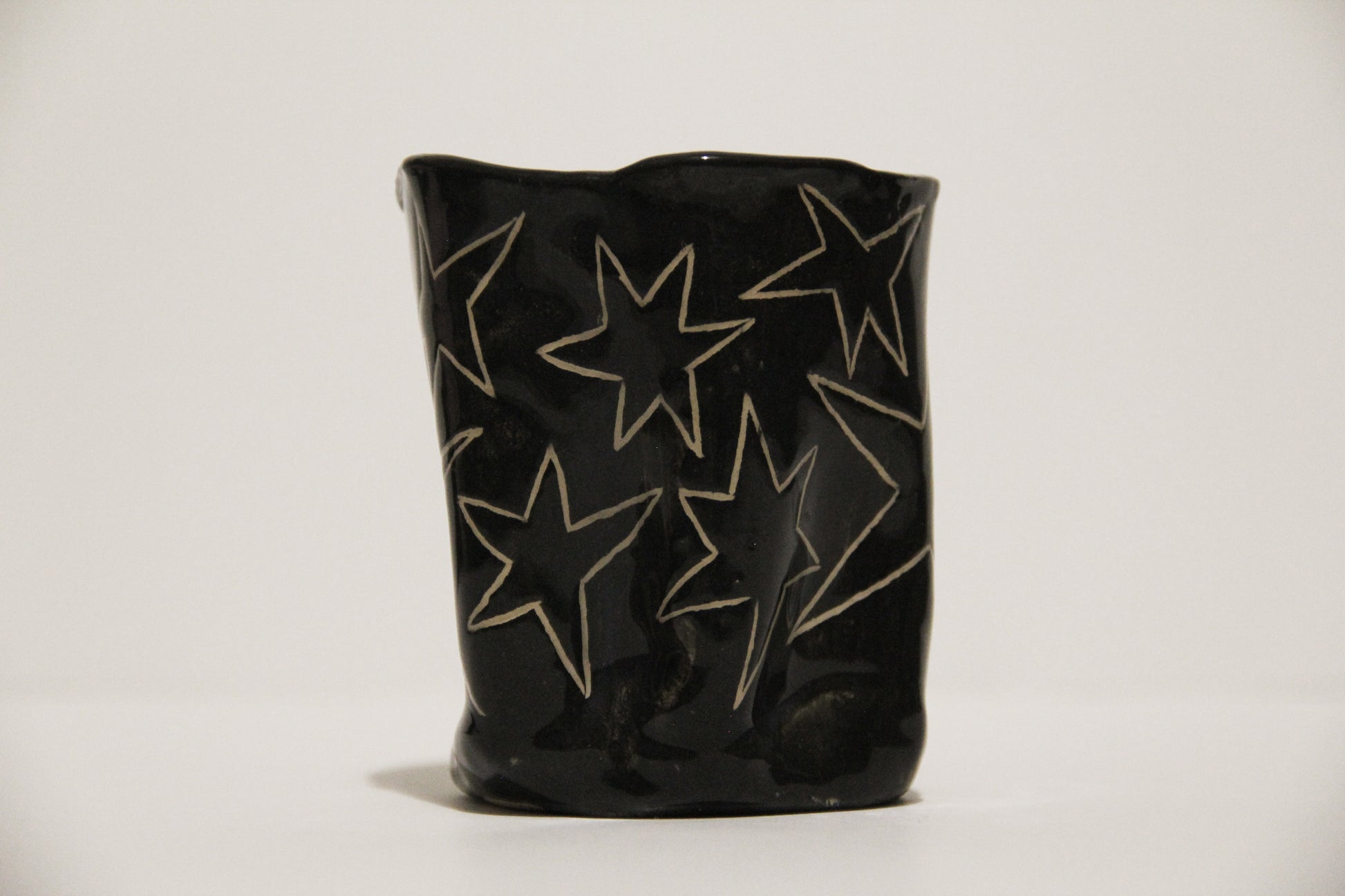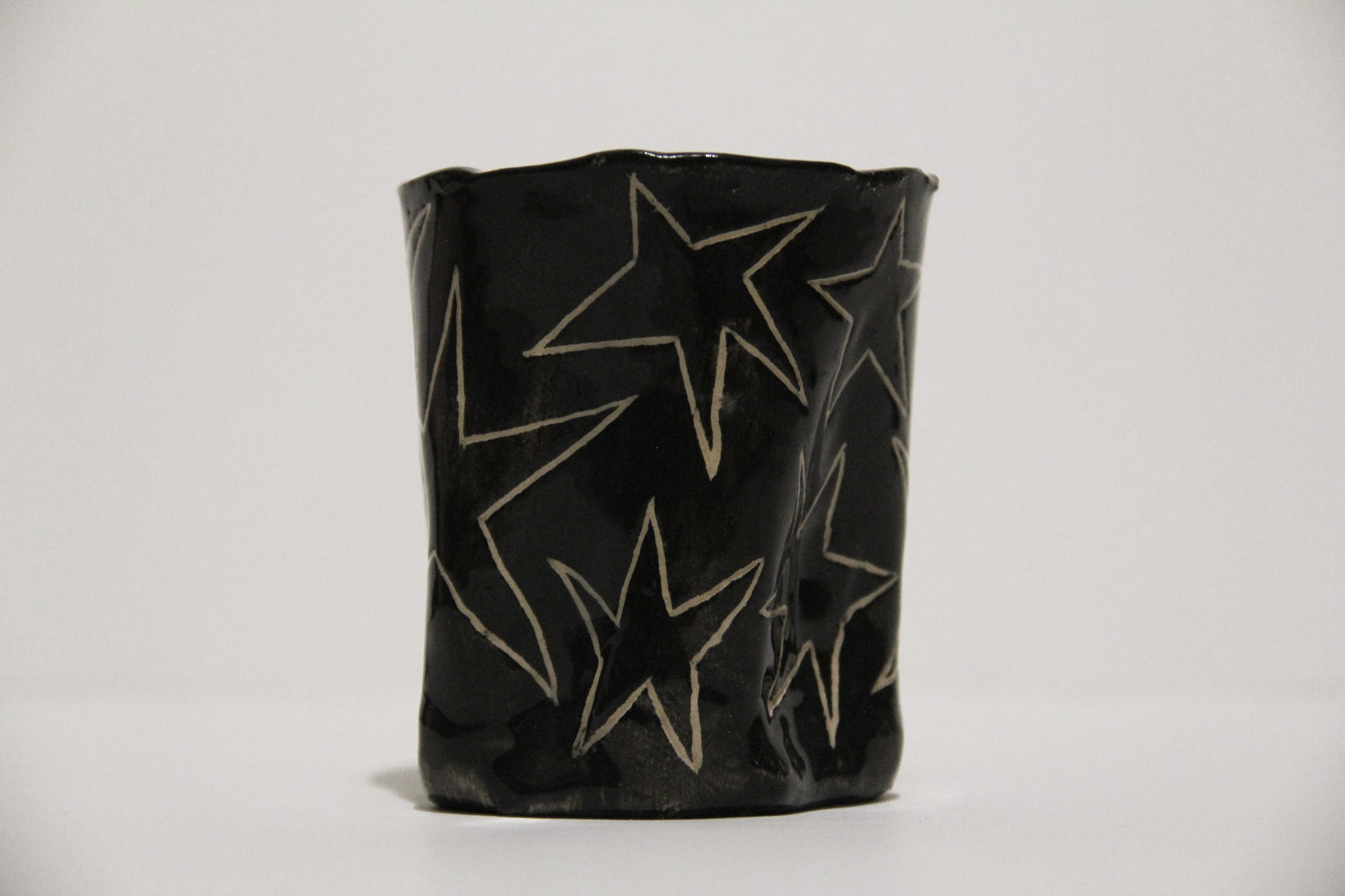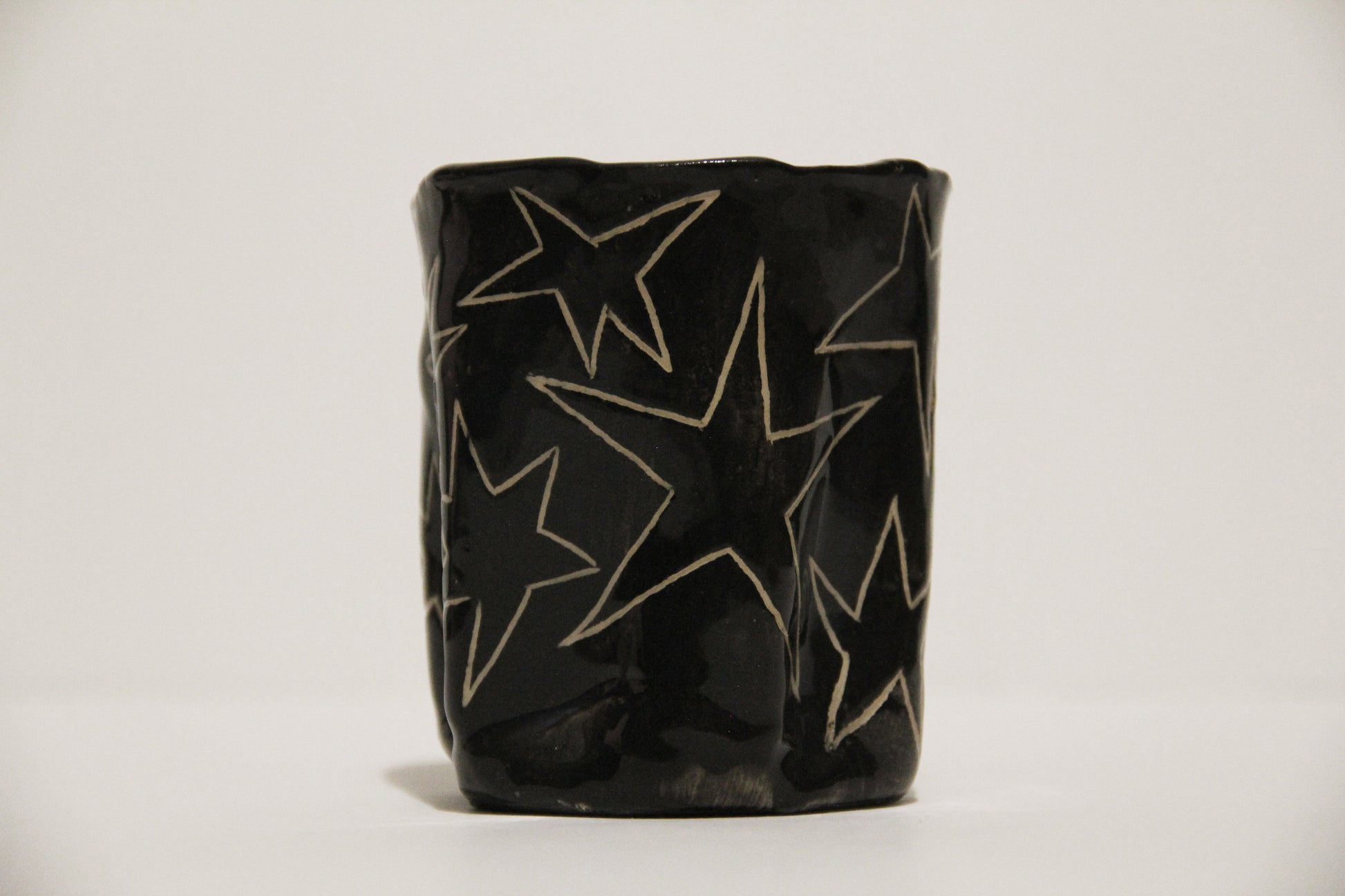 Čierny keramický hrnček s hviezdami, ideálny na kávu alebo čaj. Keramika s hlinkou.