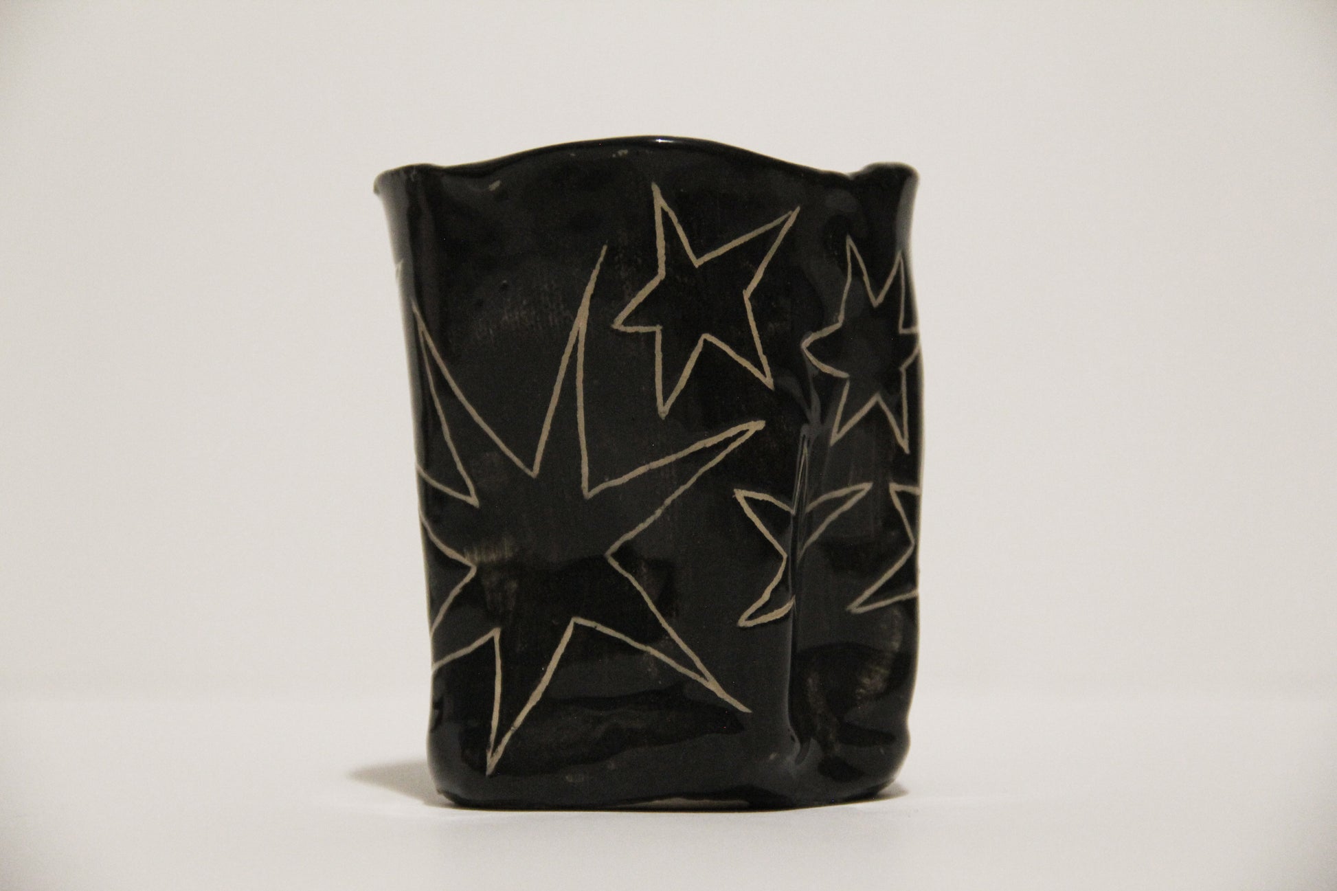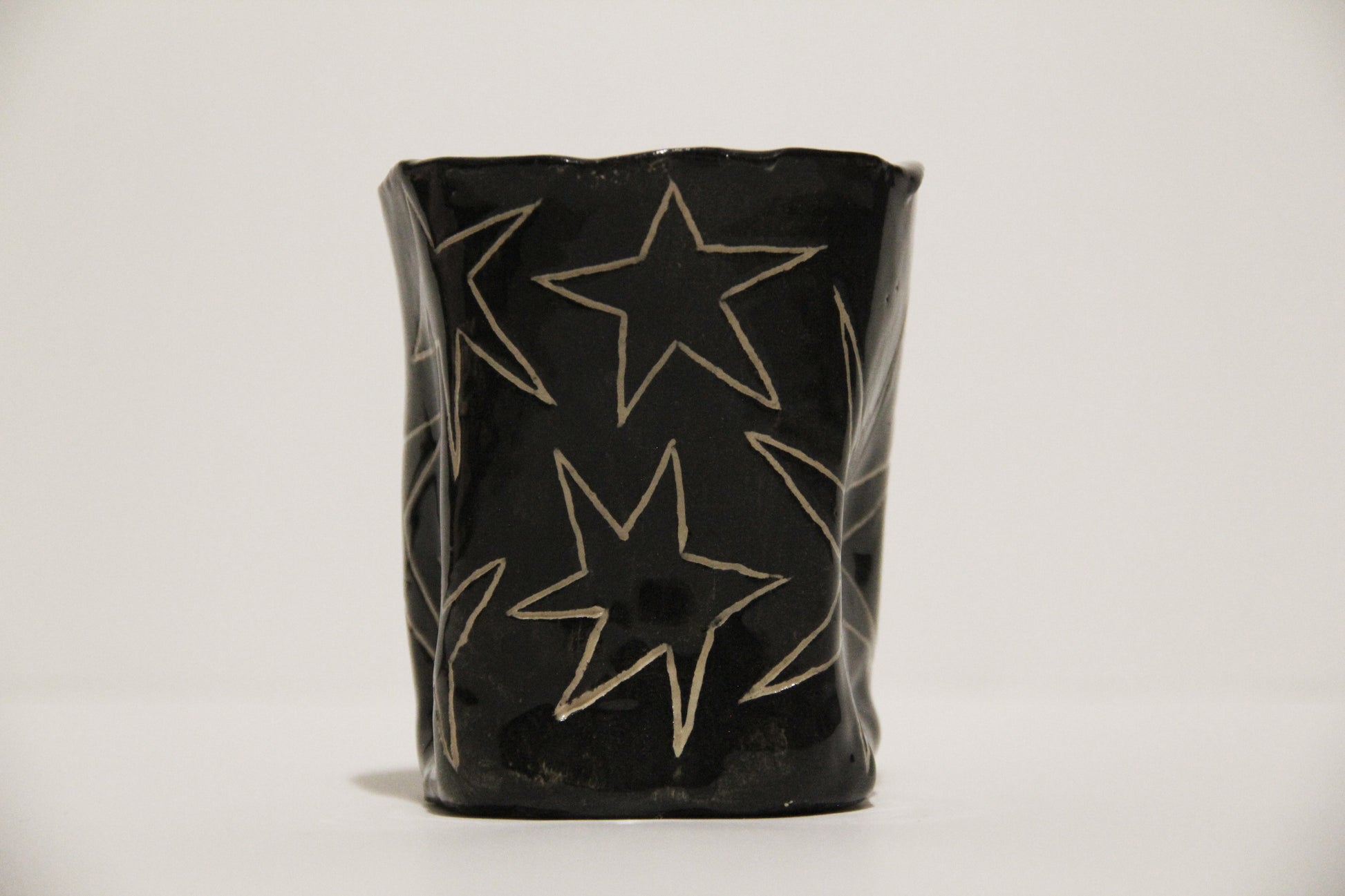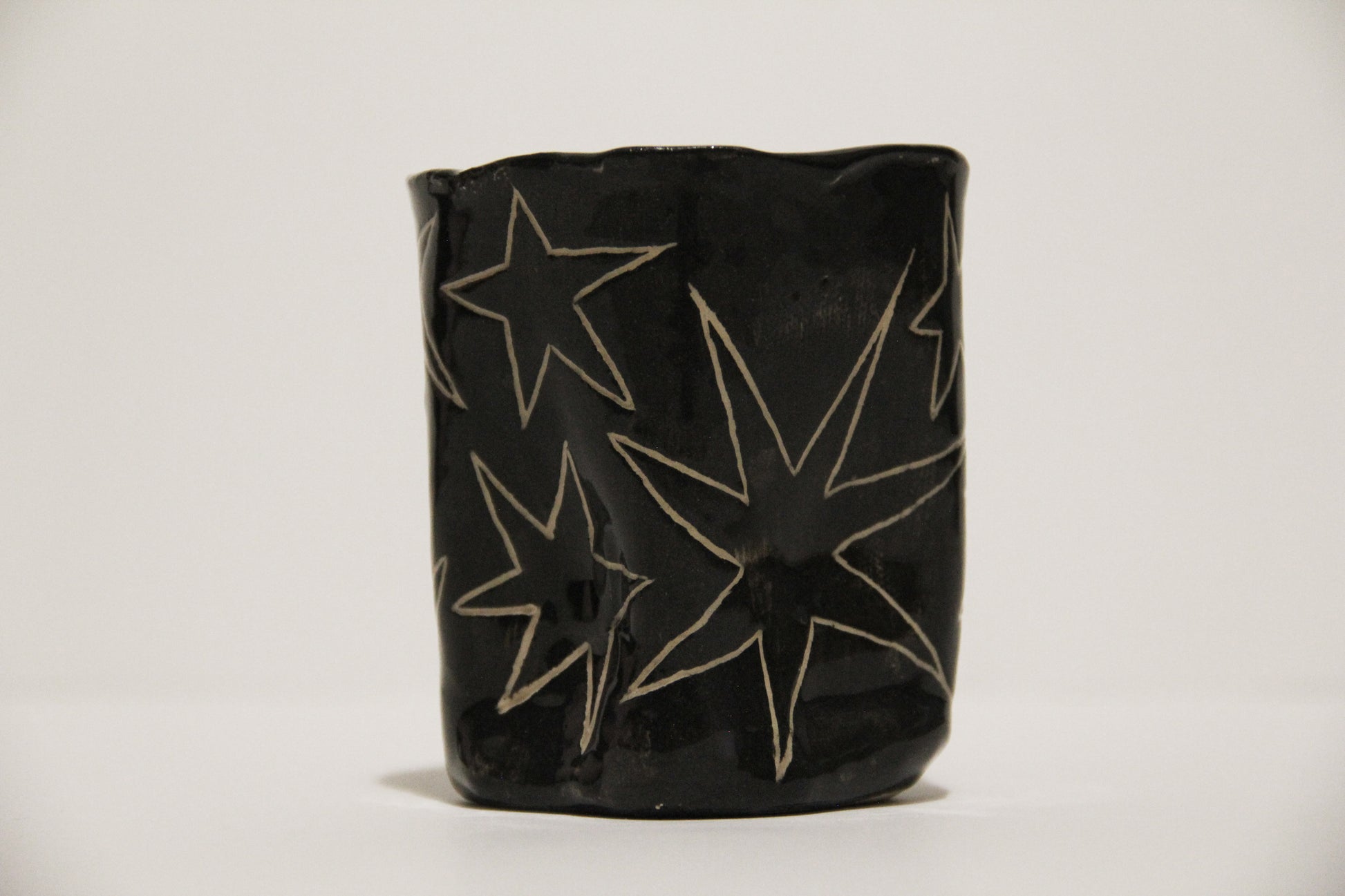 Čierny keramický hrnček s hviezdami, ideálny na kávu alebo čaj. Keramika s hlinkou.