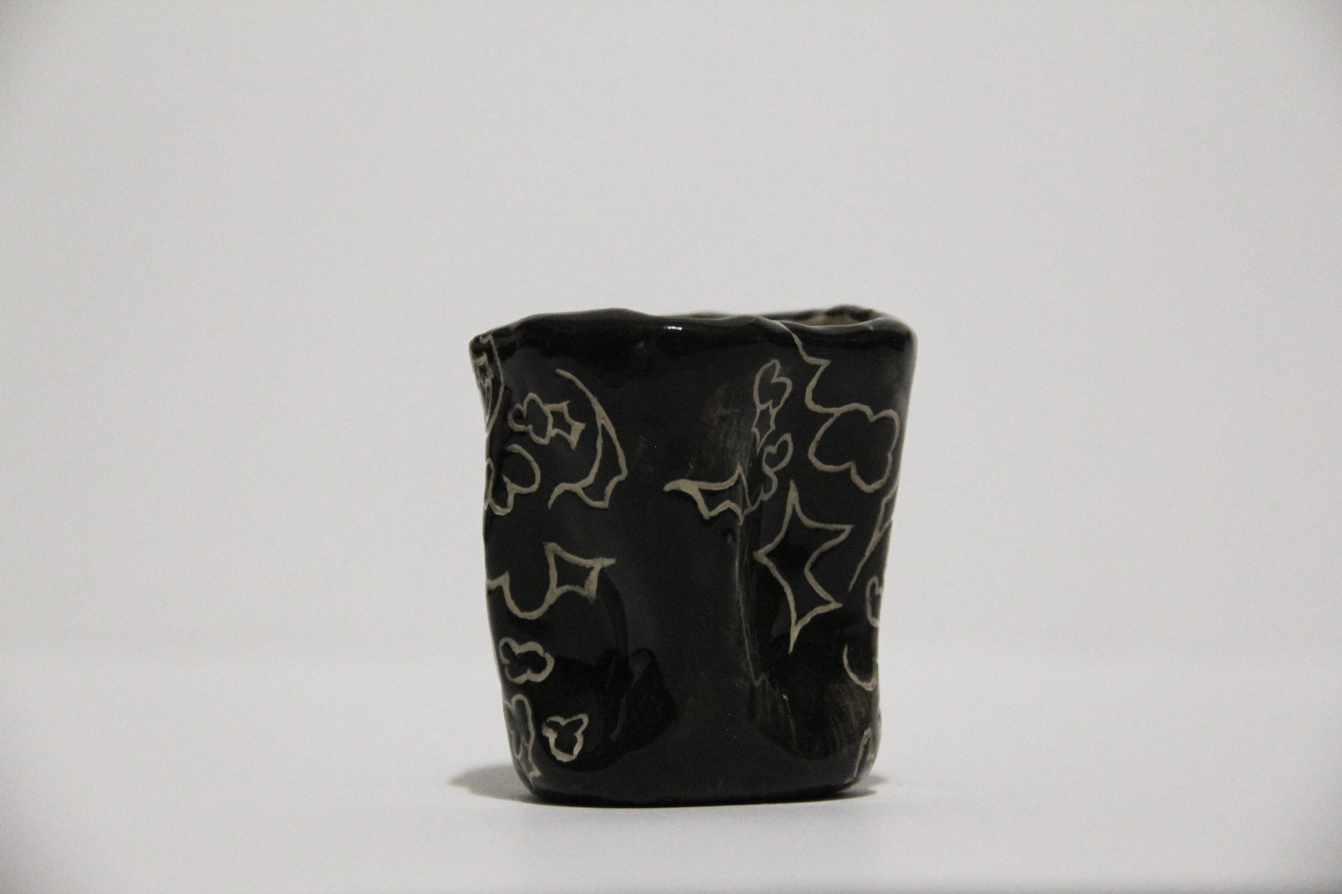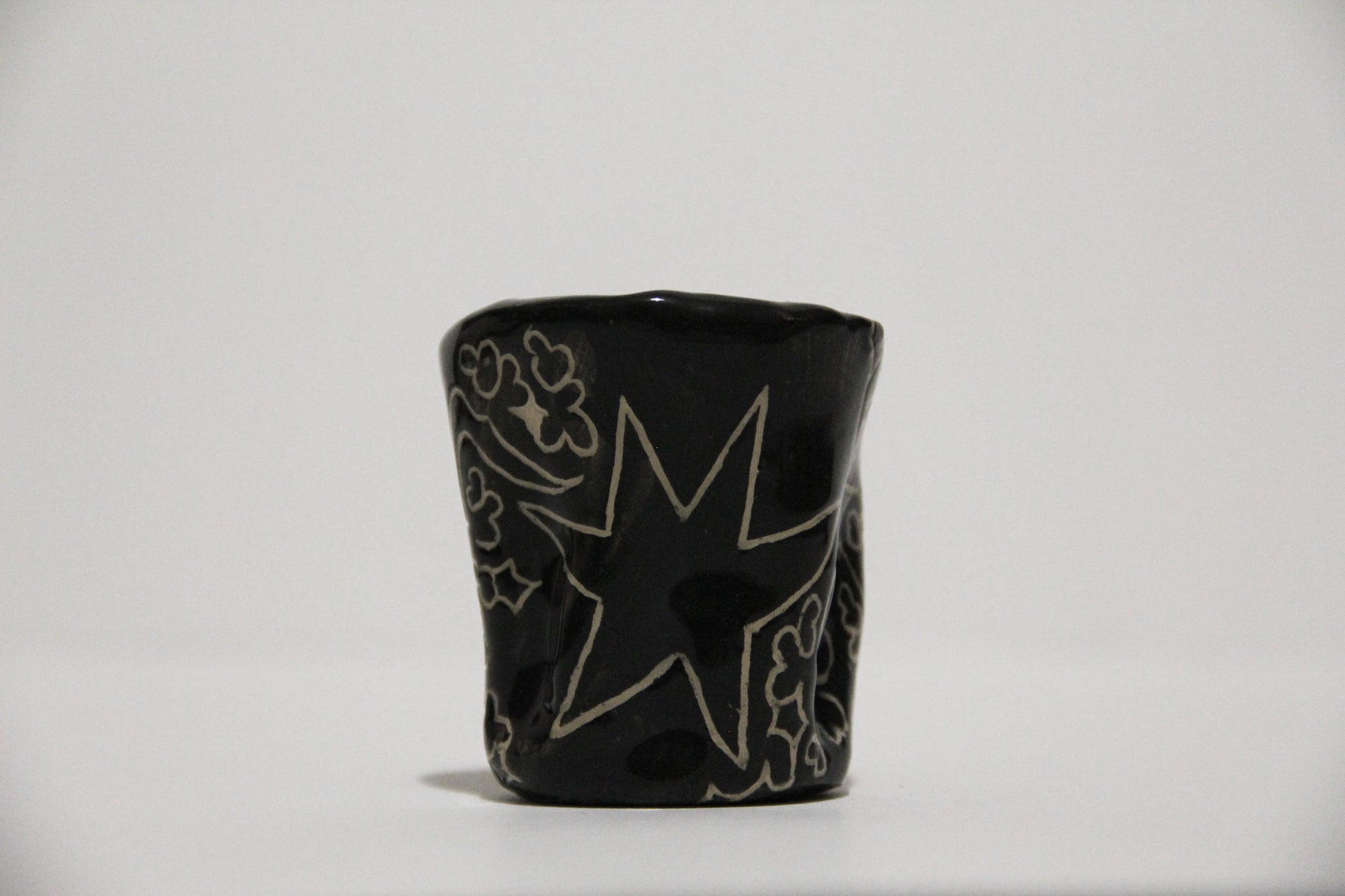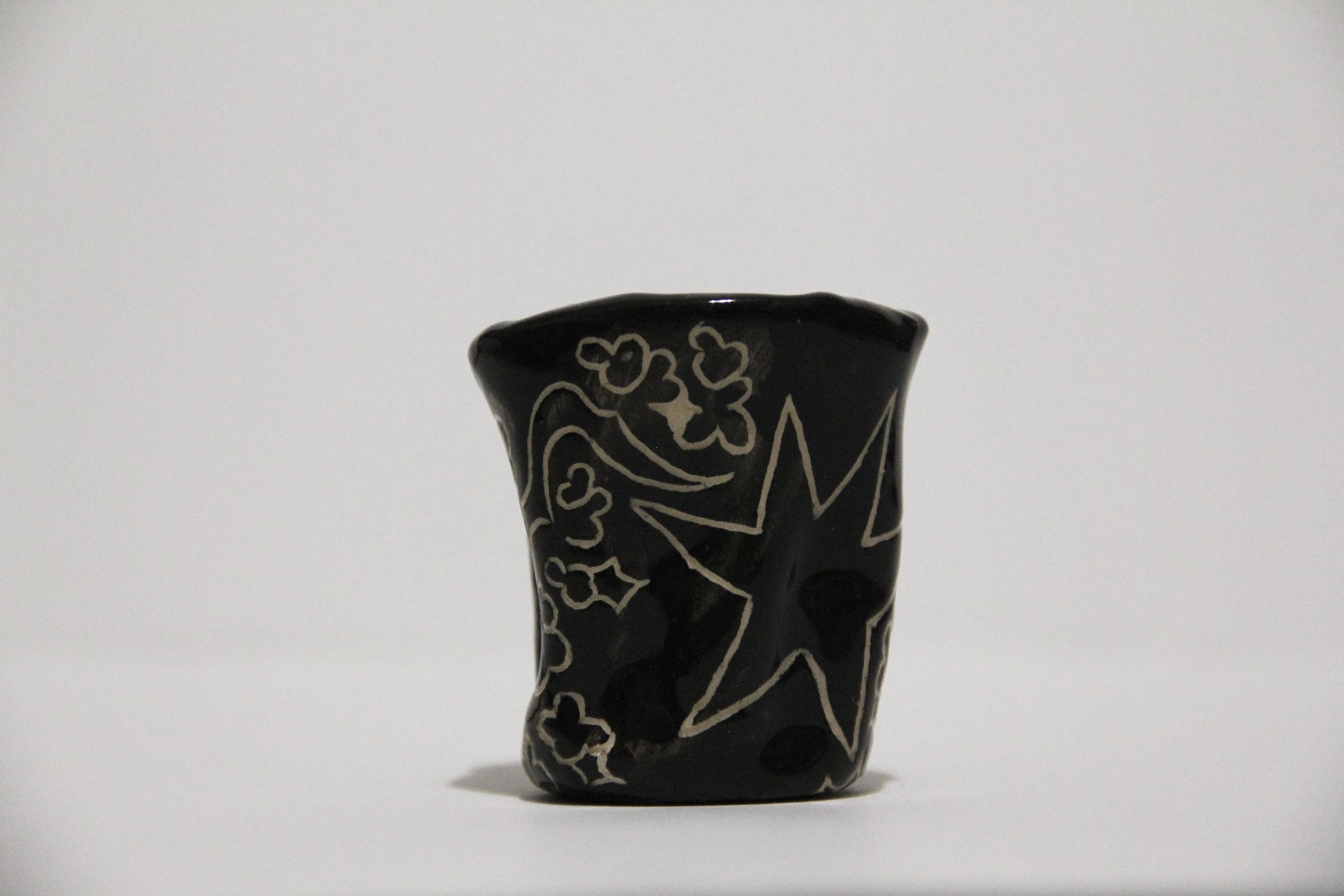 Čierny keramický hrnček s mojím charakteristickým abstraktným vzorom, ideálny na malú kávu alebo aj ako štamprlík. Keramika s hlinkou.