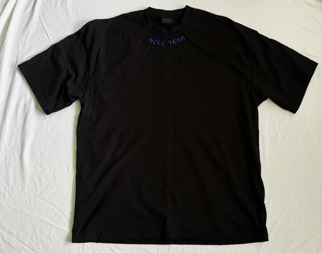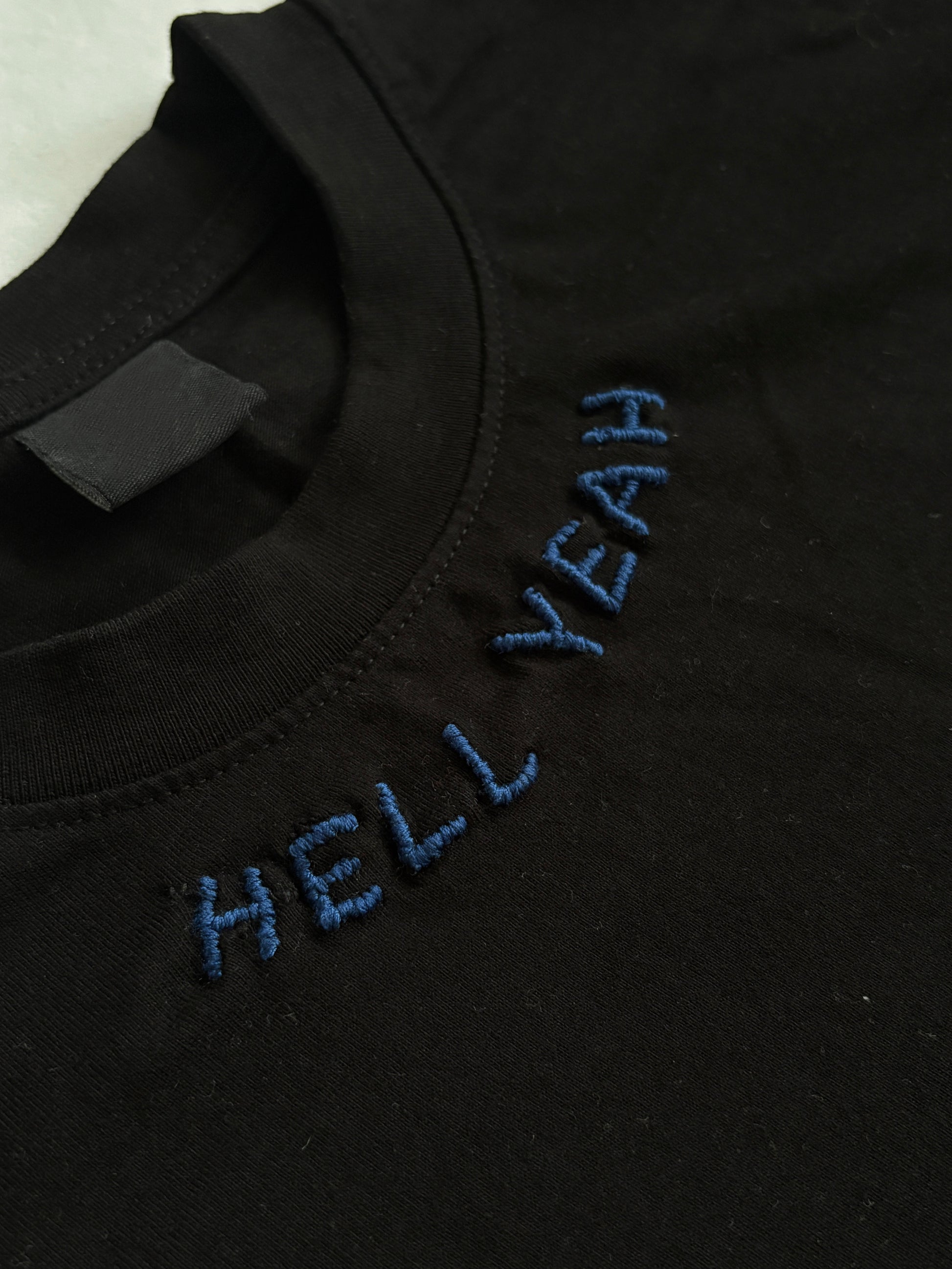 HELL YEAH vyšité obyčajnou niťou, nedokonalé ale fun. Malý tvorivý akt premenený na niečo, čo môžeš nosiť.