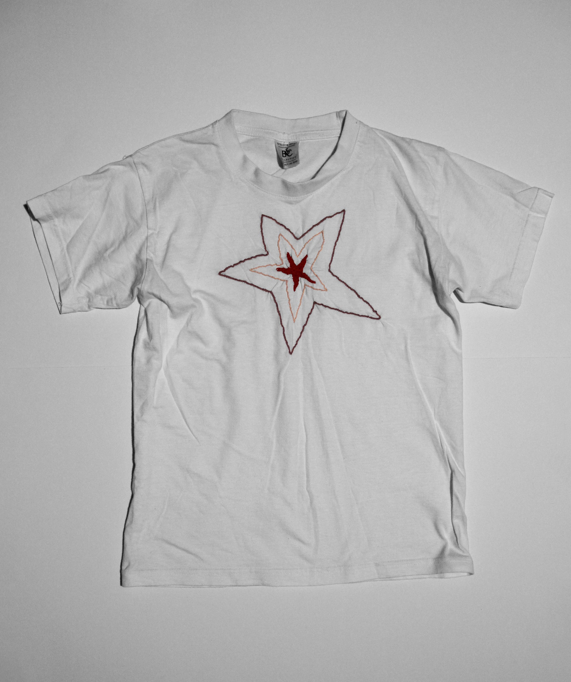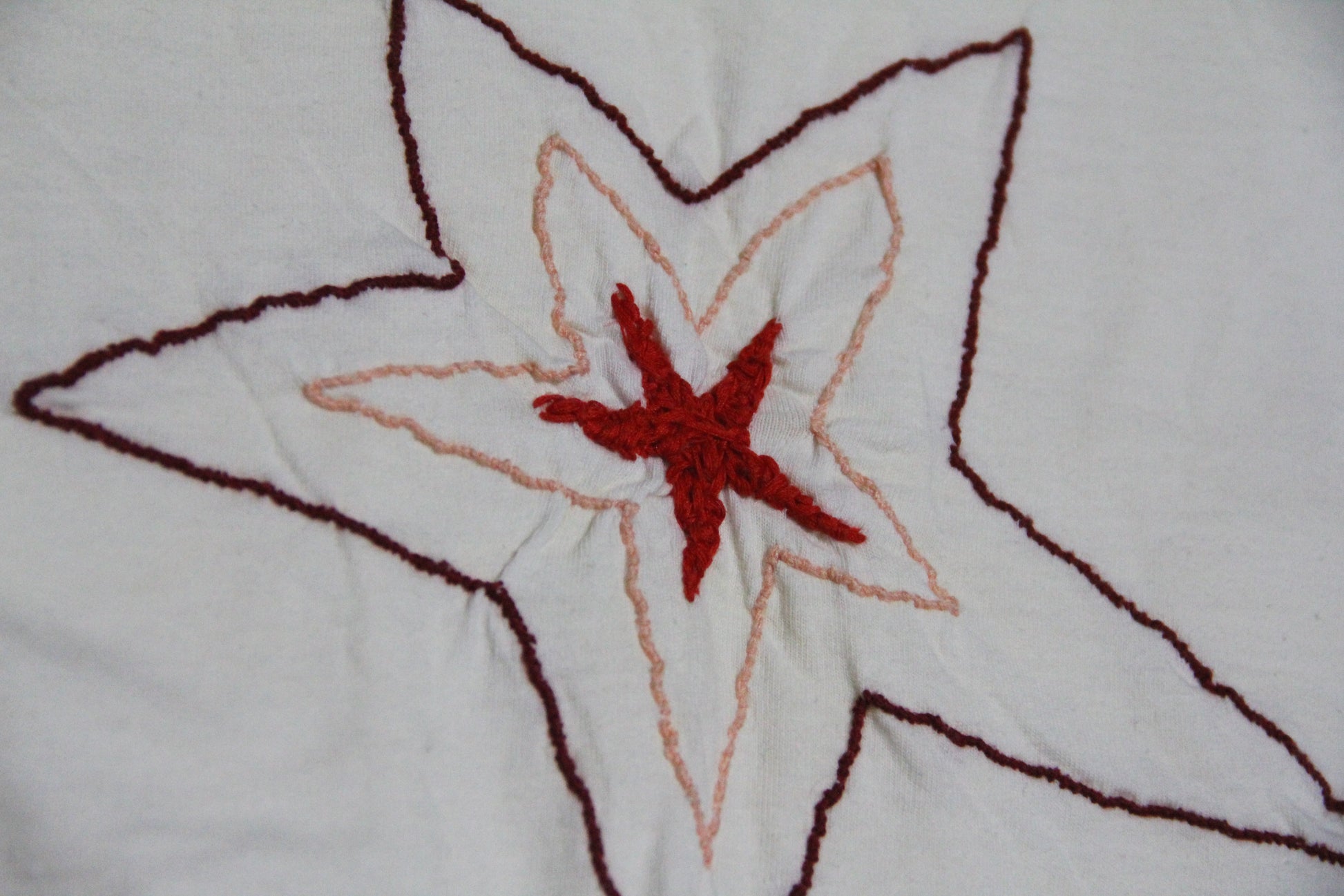 Experiment s niťou a trpezlivosťou. Hviezdy v hviezdach—ručne vyšívané obyčajnou niťou, nedokonalé a plné lásky. Malý tvorivý akt premenený na niečo, čo môžeš nosiť.