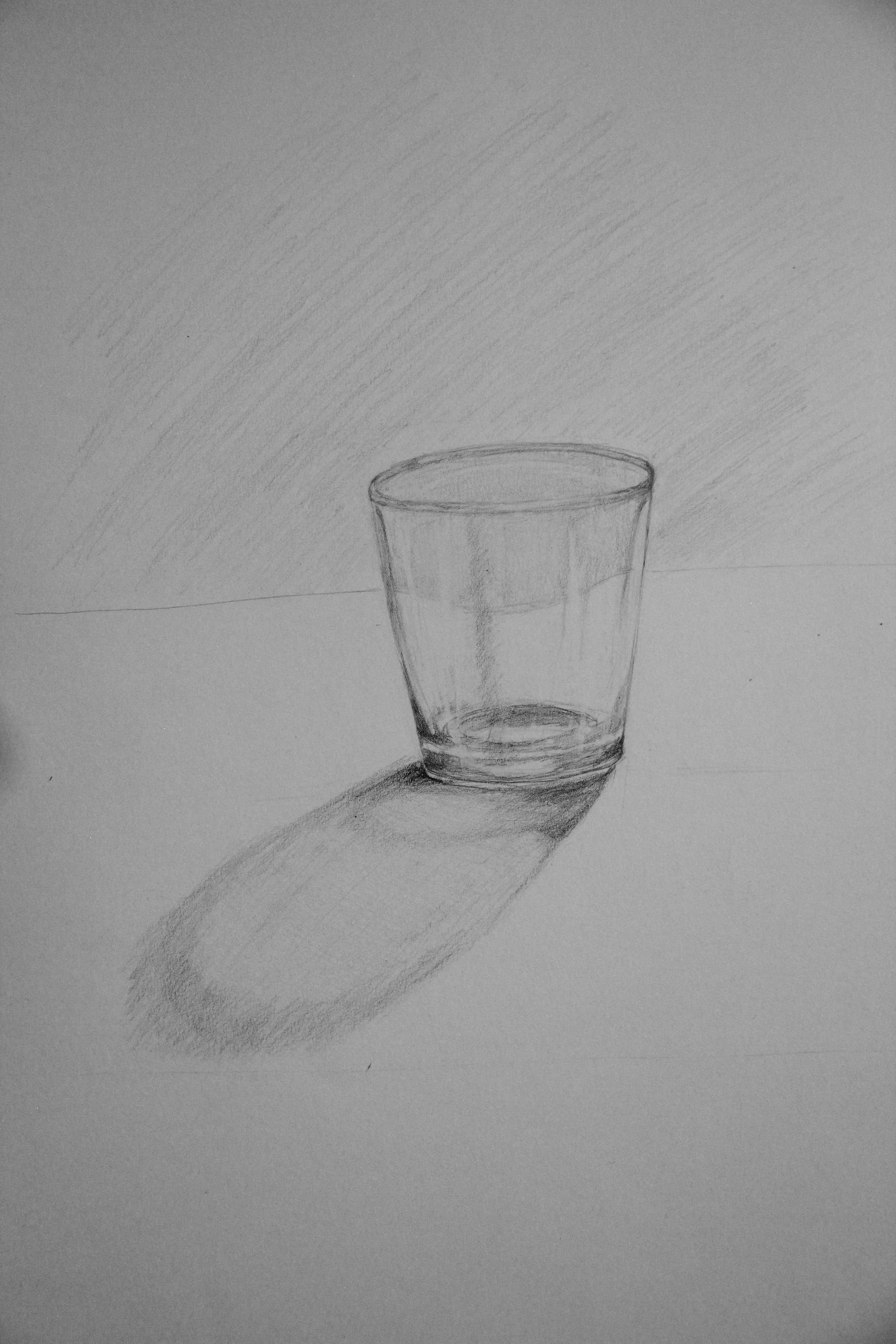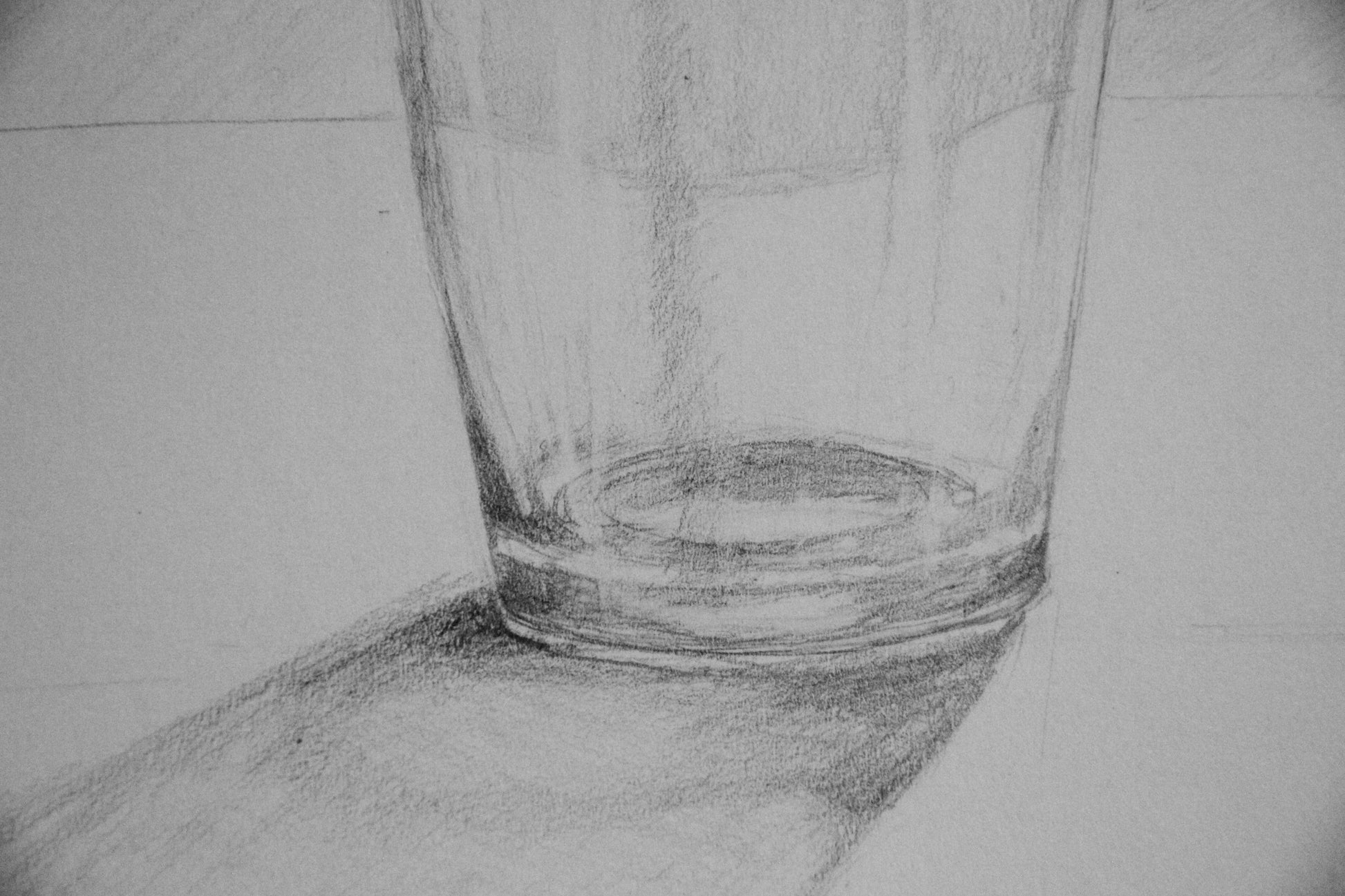 Zátišie, kresba skleneného pohára, štúdia materiálu a tieňov, ceruzka na papieri, A3.