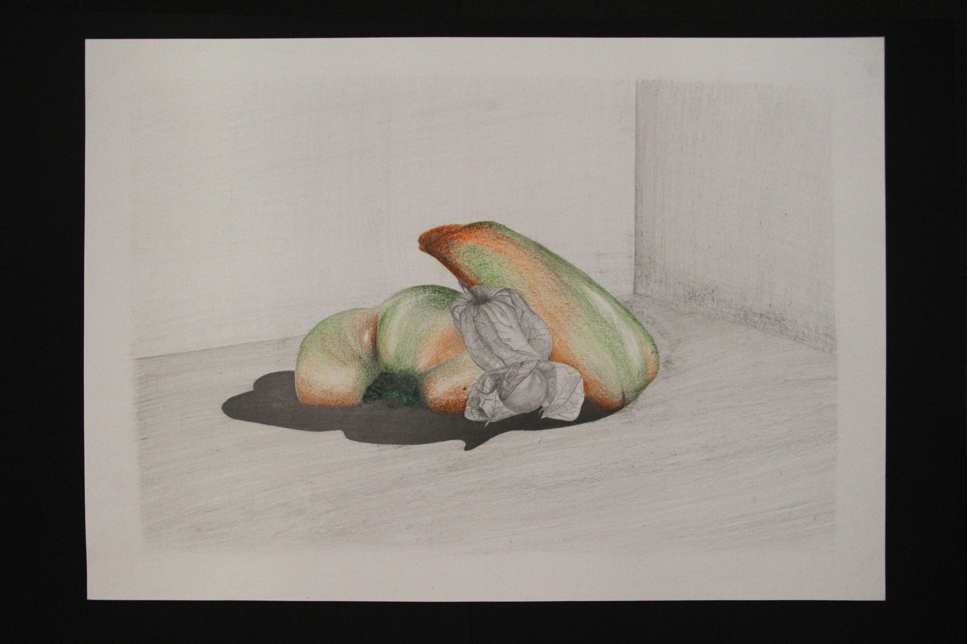 Zátišie, kresba papriky, štúdia materiálu a tieňov, ceruzka na papieri, A3.