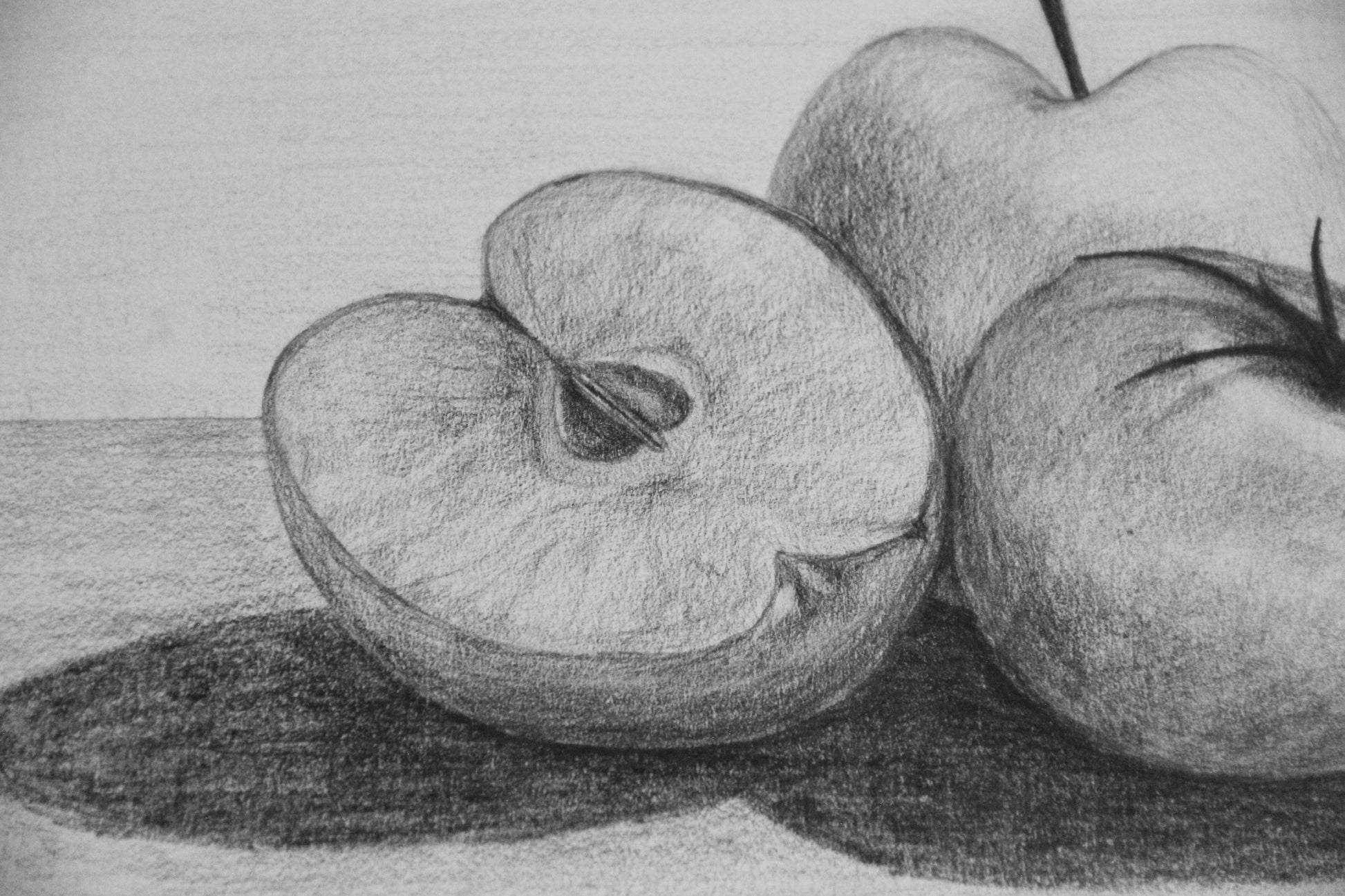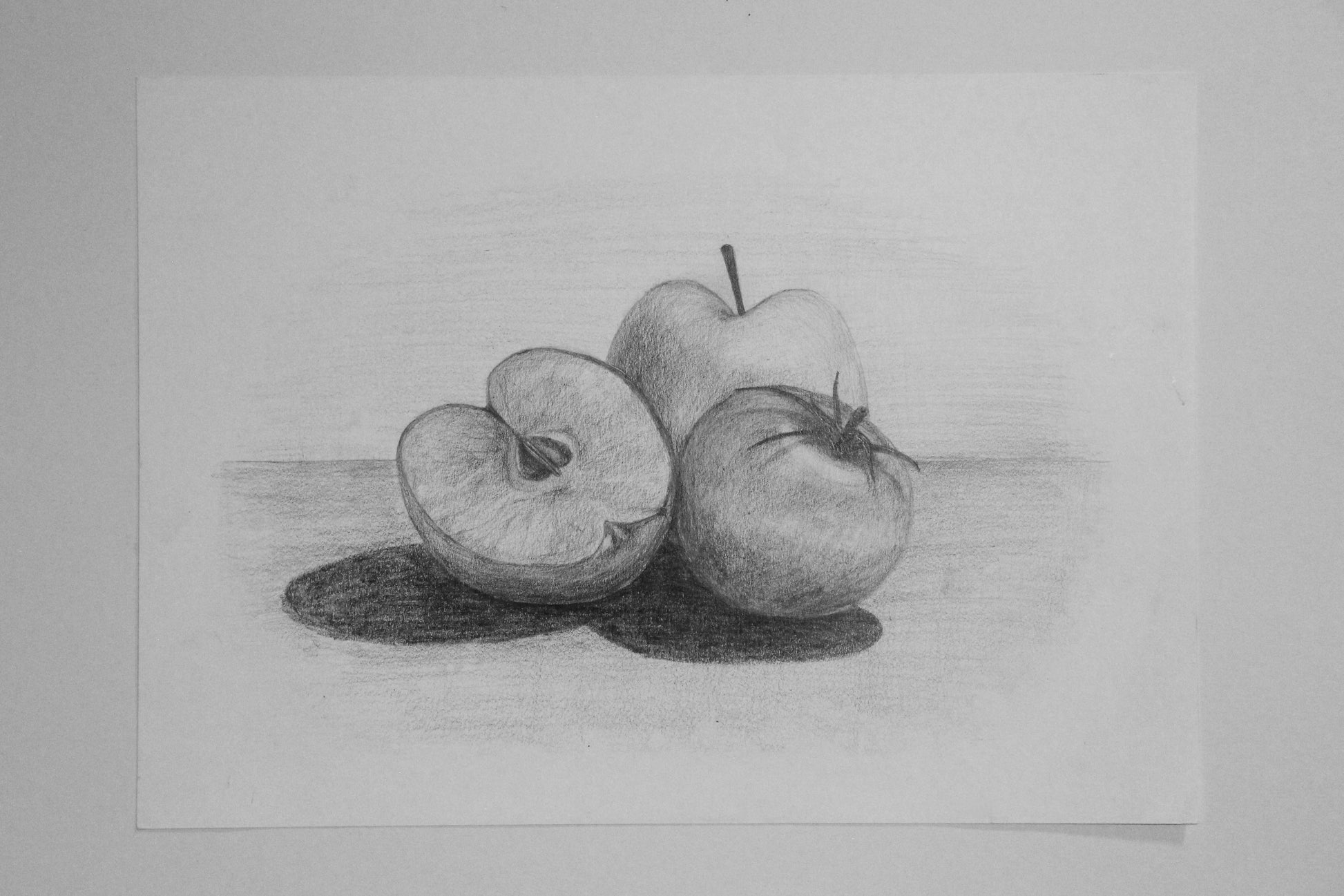 Zátišie, kresba jablka a rajčiny, ceruzka na papieri, A4.