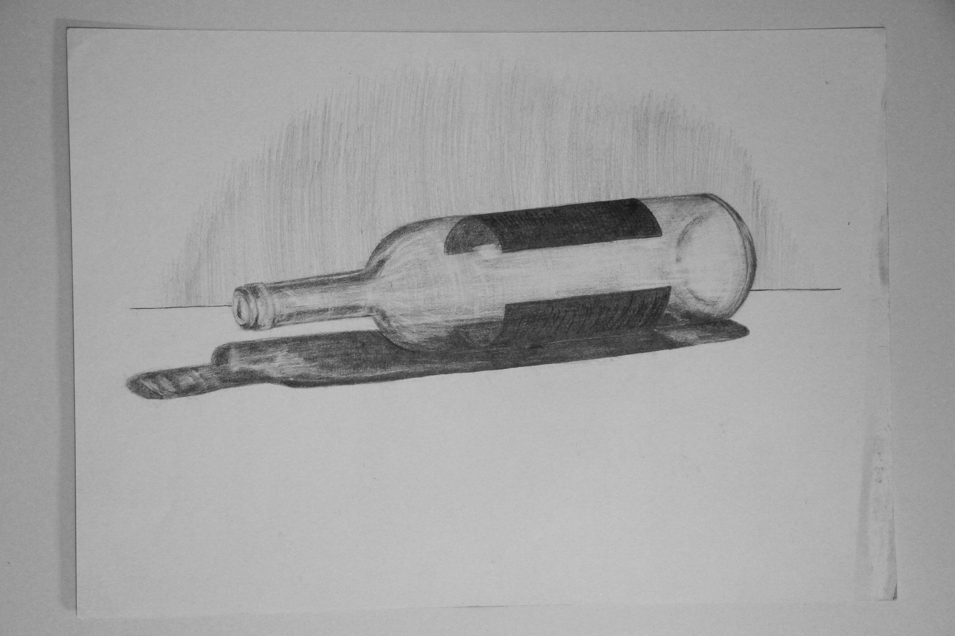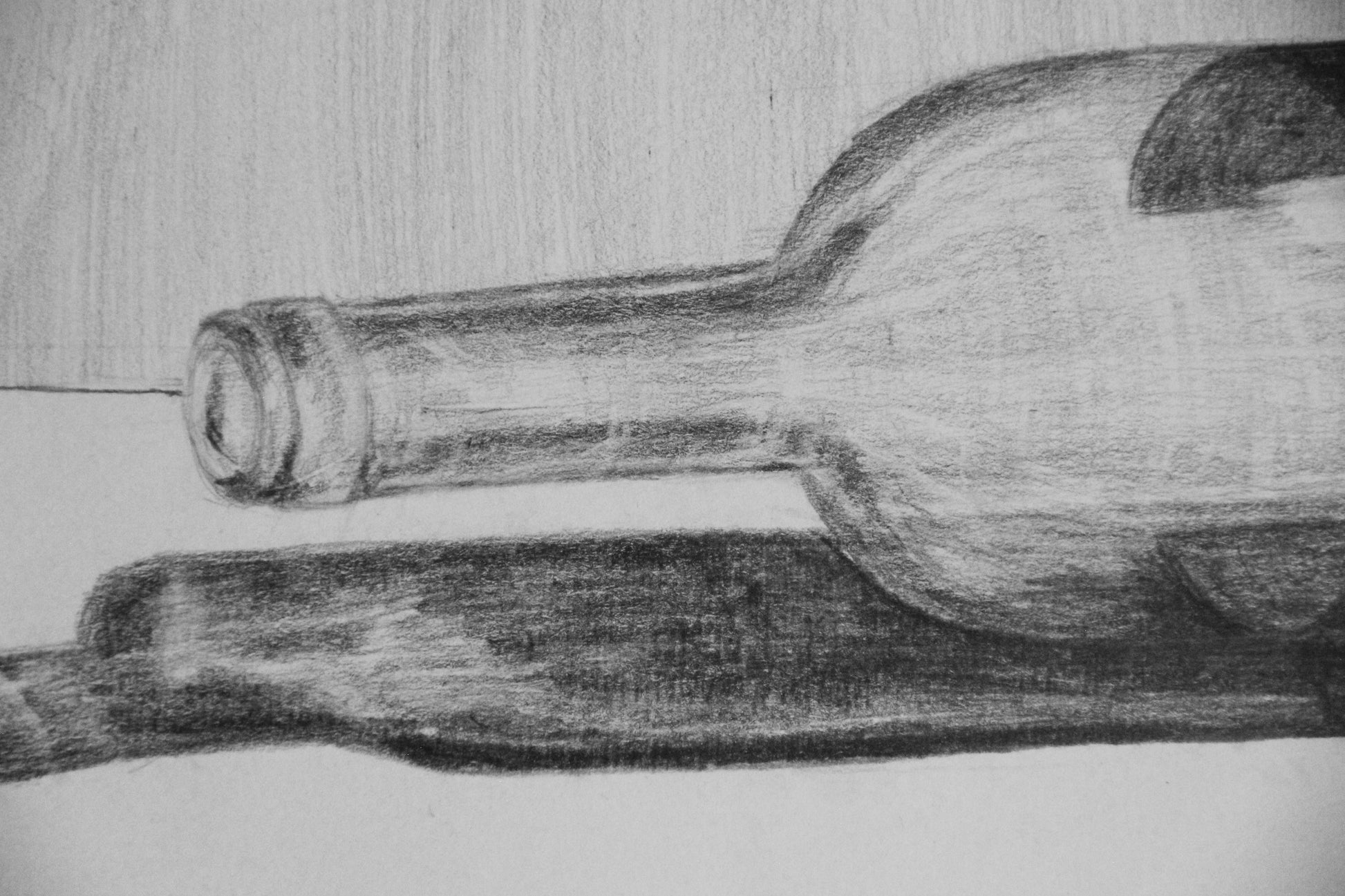 Zátišie, fľaša od vína, ceruzka na papieri, A3.