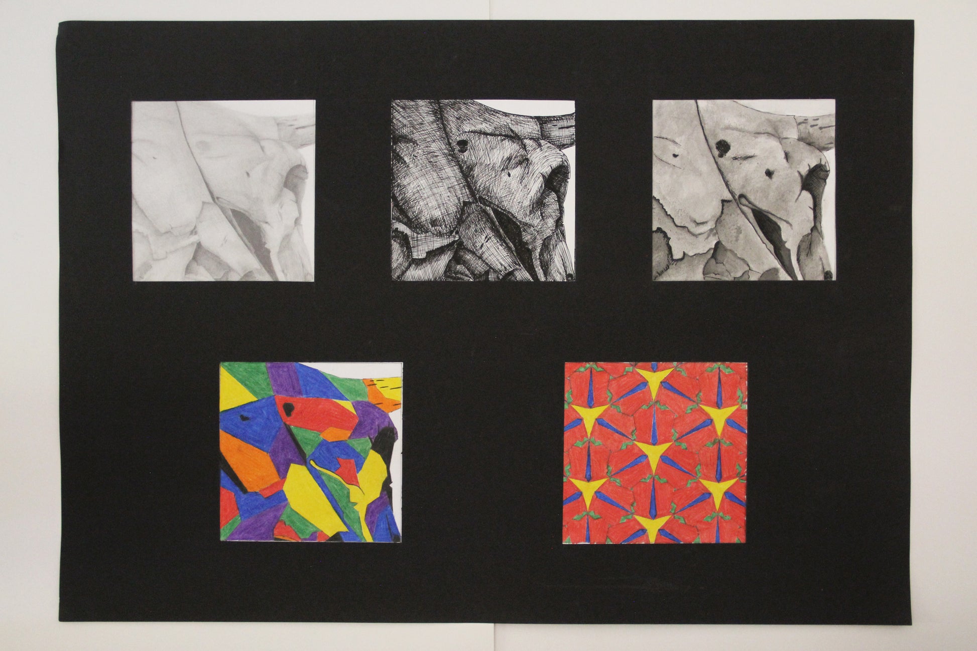 Séria piatich 15cm x 15 cm štvorcov, každý zobrazujúc zvieraciu lebku iným spôsobom. Prvý je realistická kresba ceruzkou, druhý spravený tušom, tretí maľovaný tušom a vodou pomocou štetca s jemnými detailmi doplnenými perom, štvrtý pastelkami v štylizovanej podobe a piaty ako geometrická abstrakcia. Spolu skúmajú formu, techniku a prechod od pozorovania k predstavivosti.