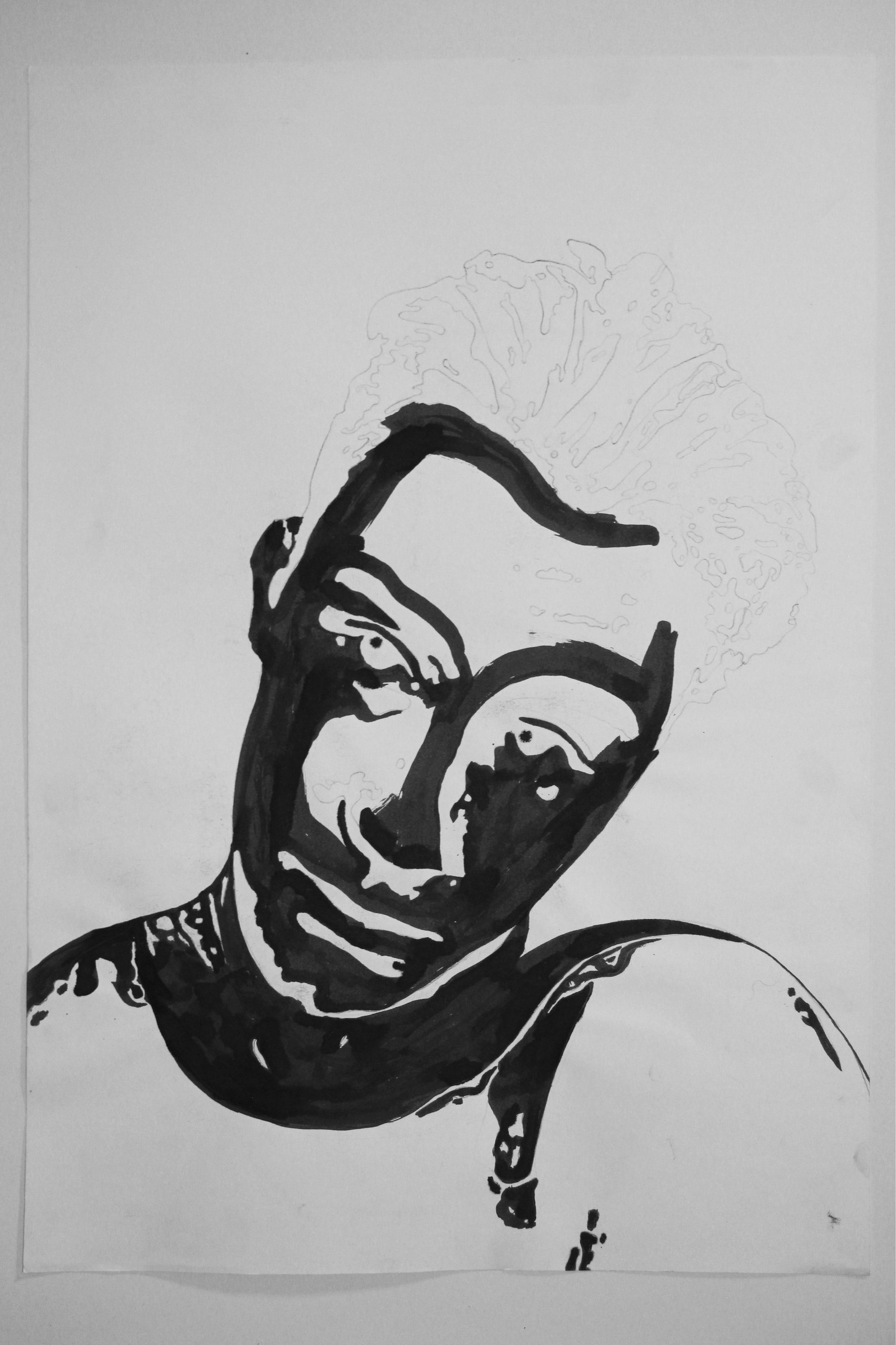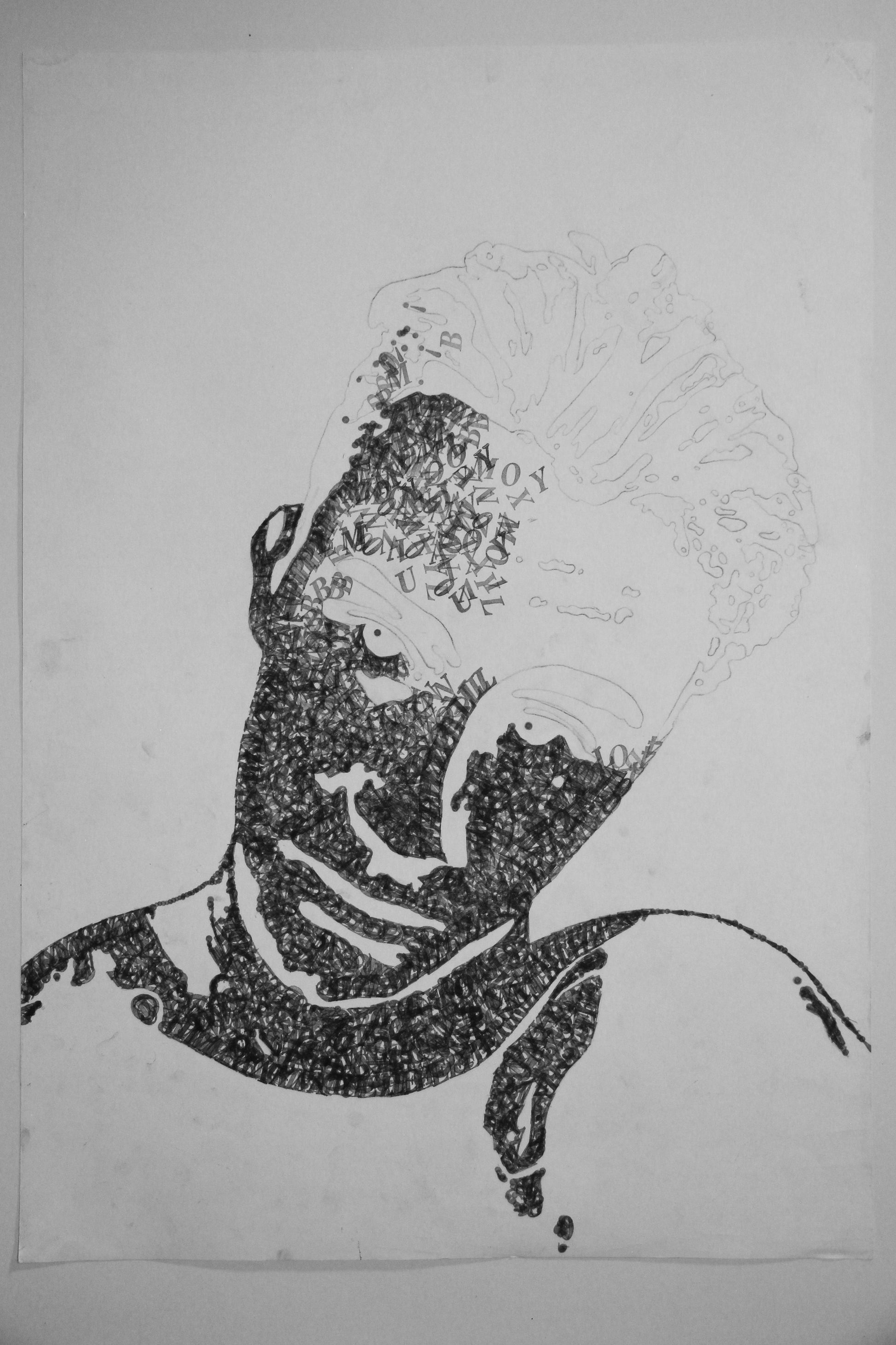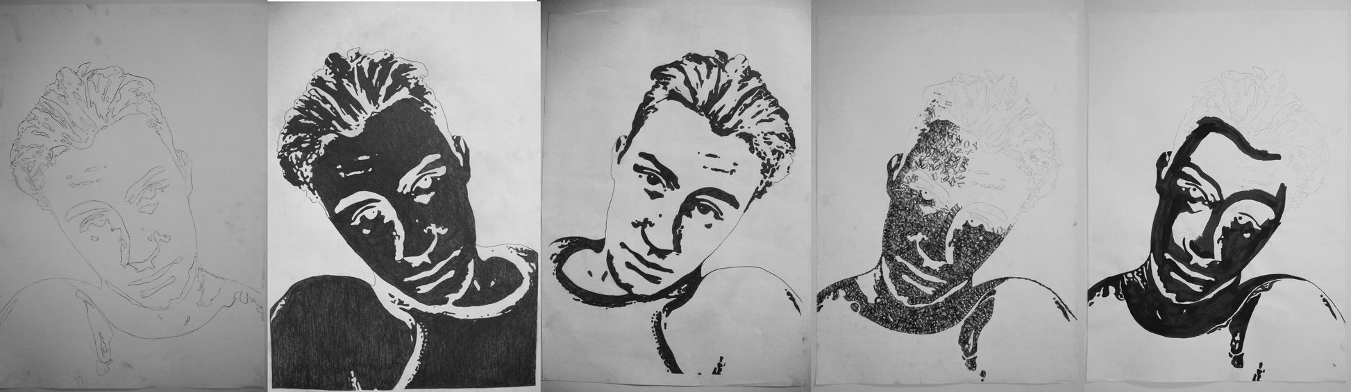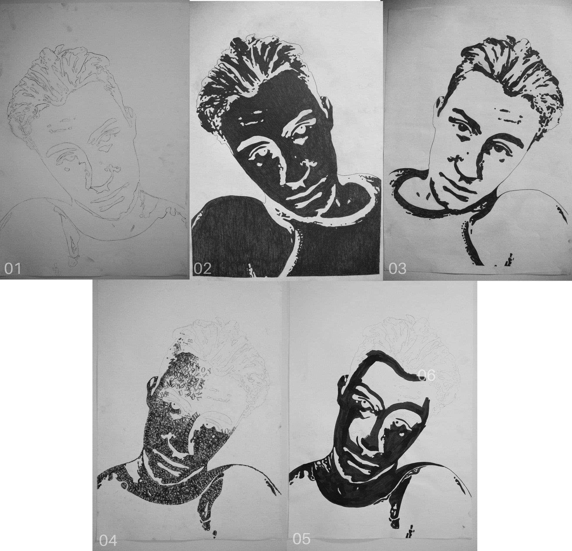 Štylizované portréty Dominik, zmiešané médiá (ceruzka, tuš, typografická pečiatka) na papieri, každý A2.