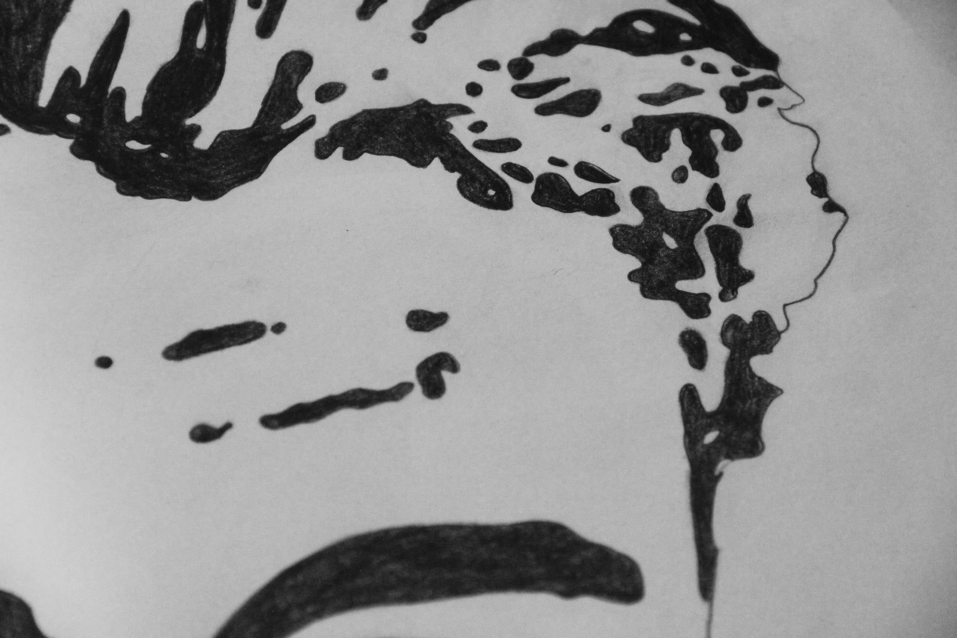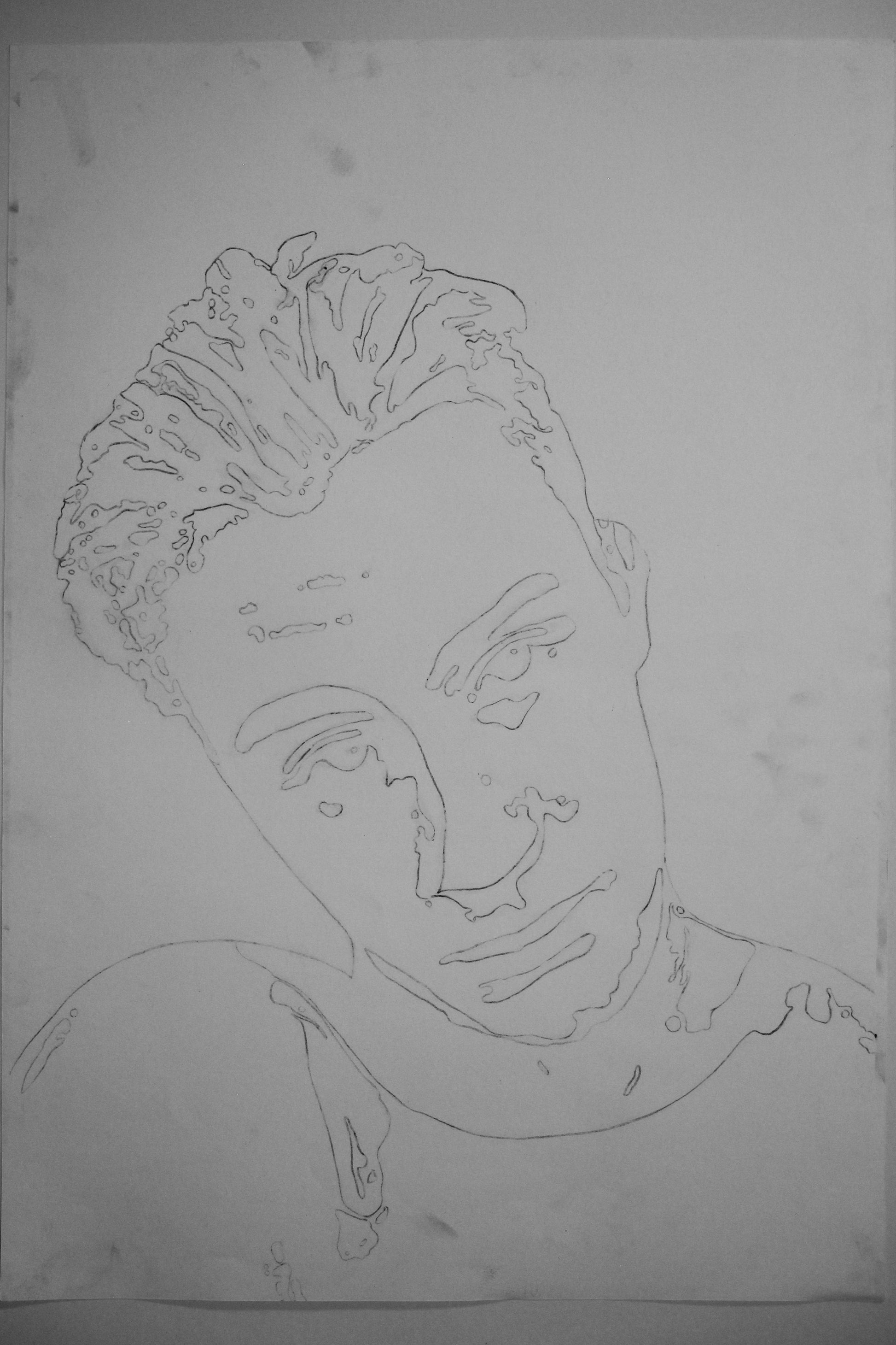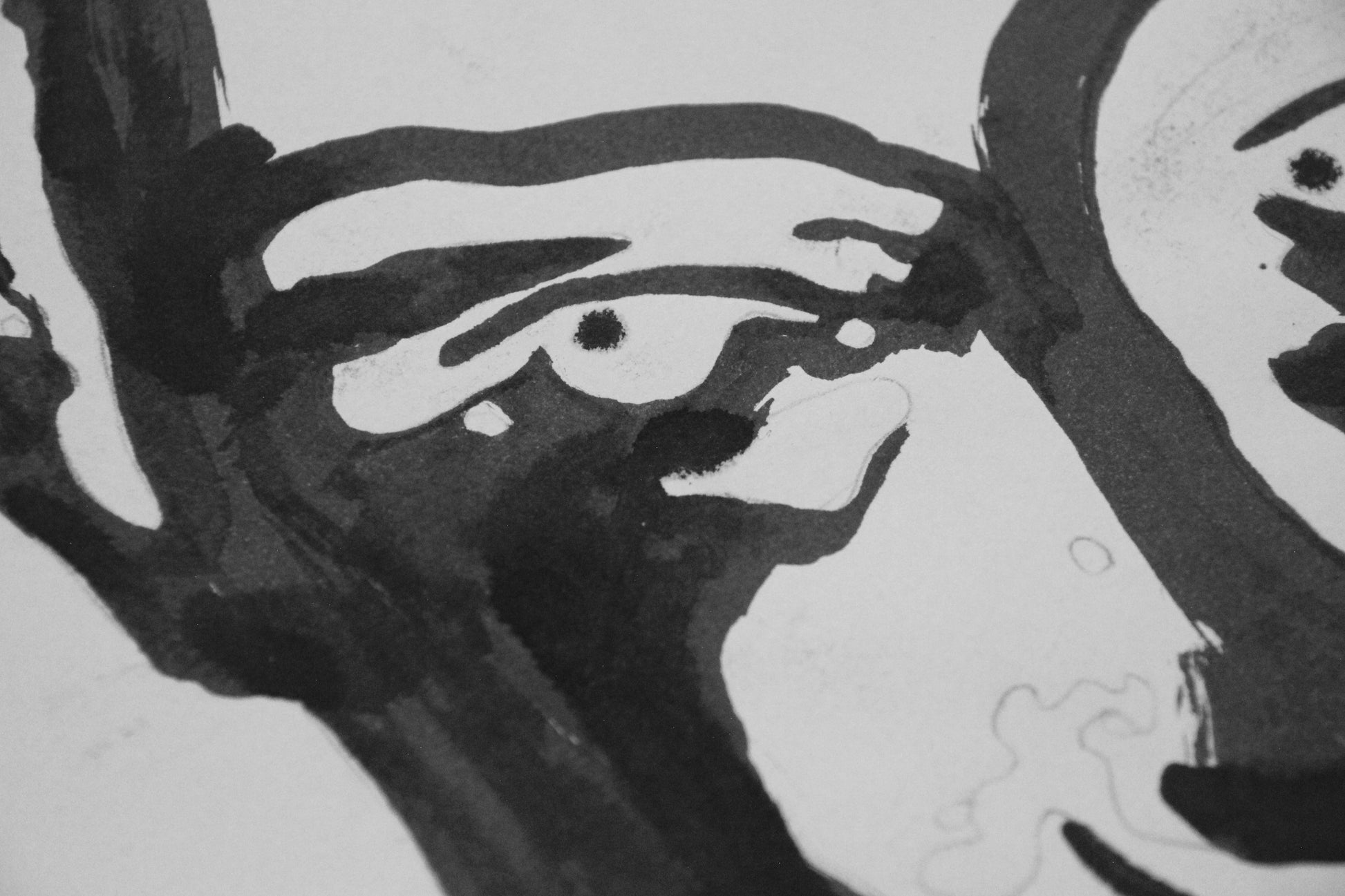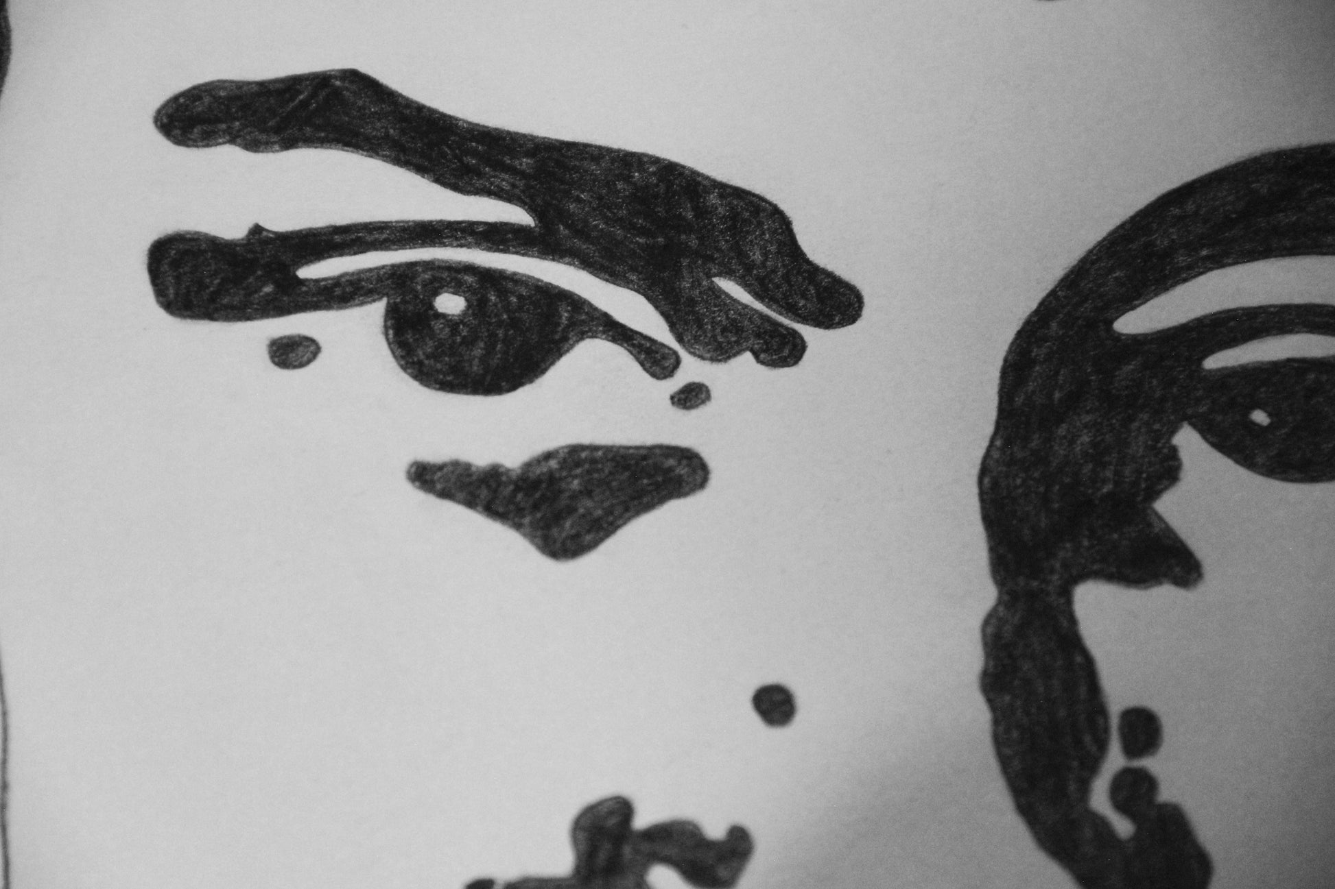 Štylizované portréty Dominik, zmiešané médiá (ceruzka, tuš, typografická pečiatka) na papieri, každý A2.