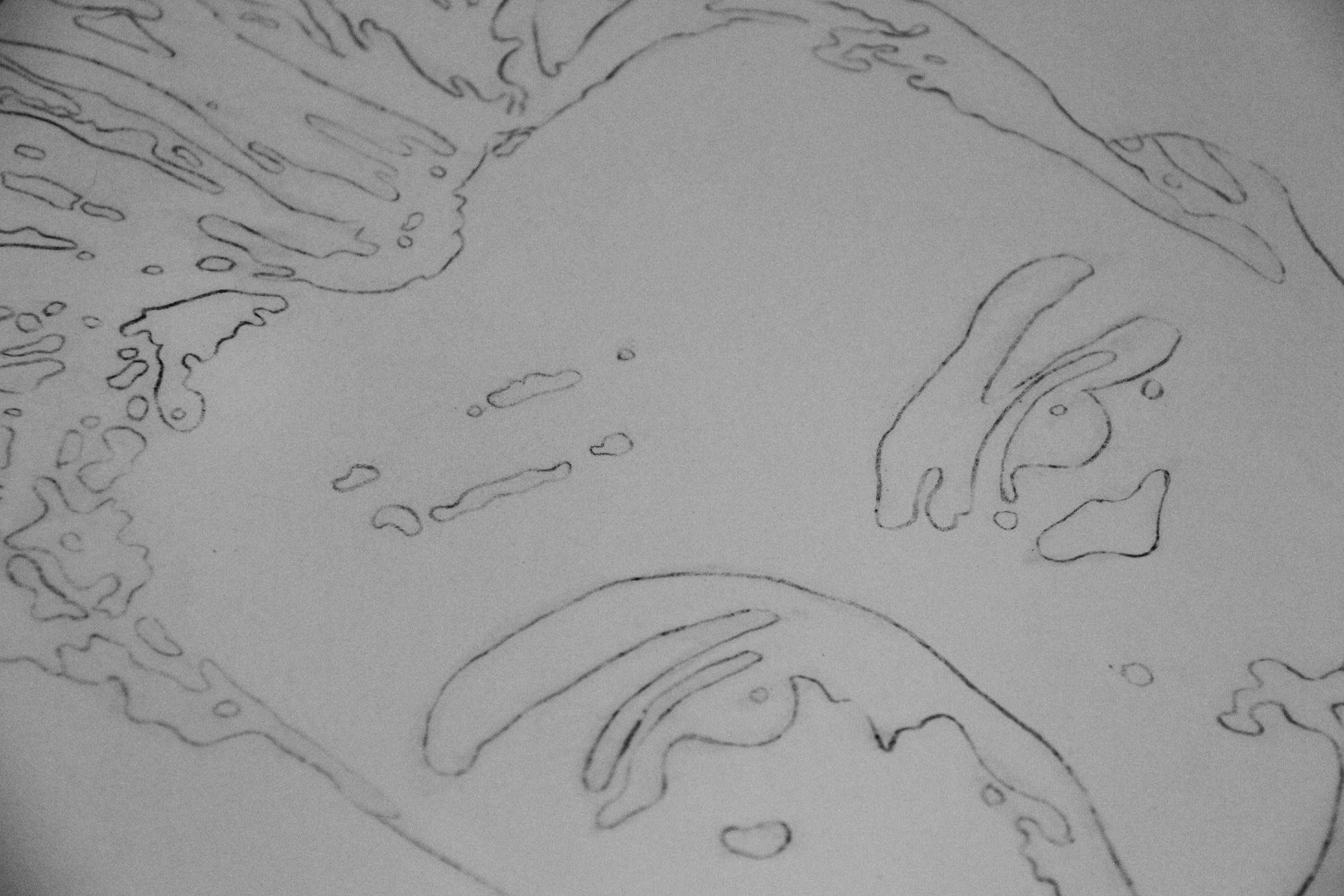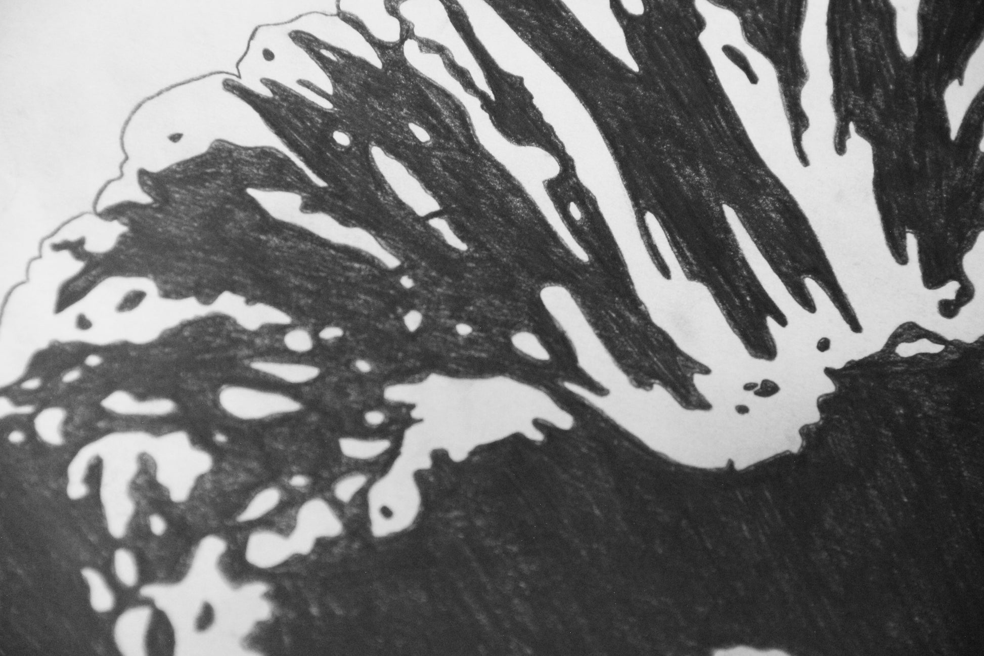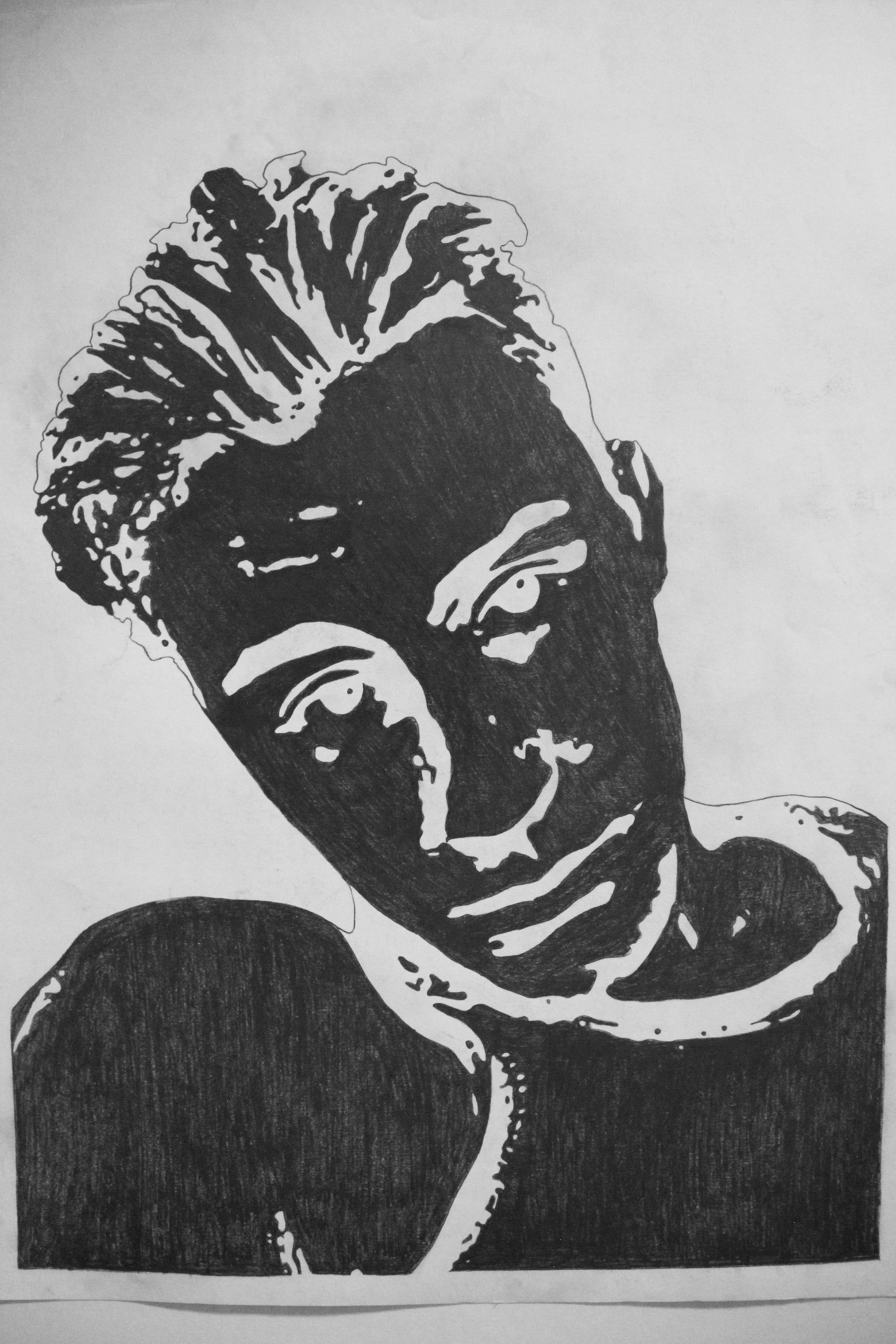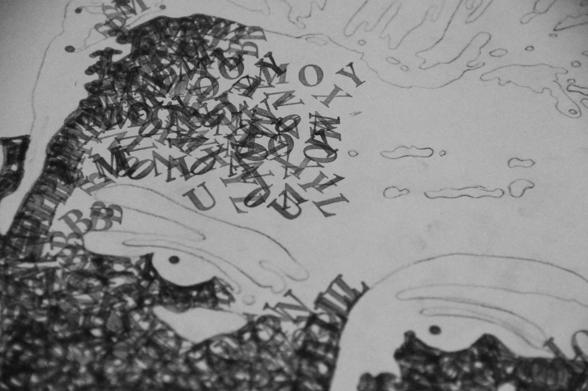 Štylizované portréty Dominik, zmiešané médiá (ceruzka, tuš, typografická pečiatka) na papieri, každý A2.