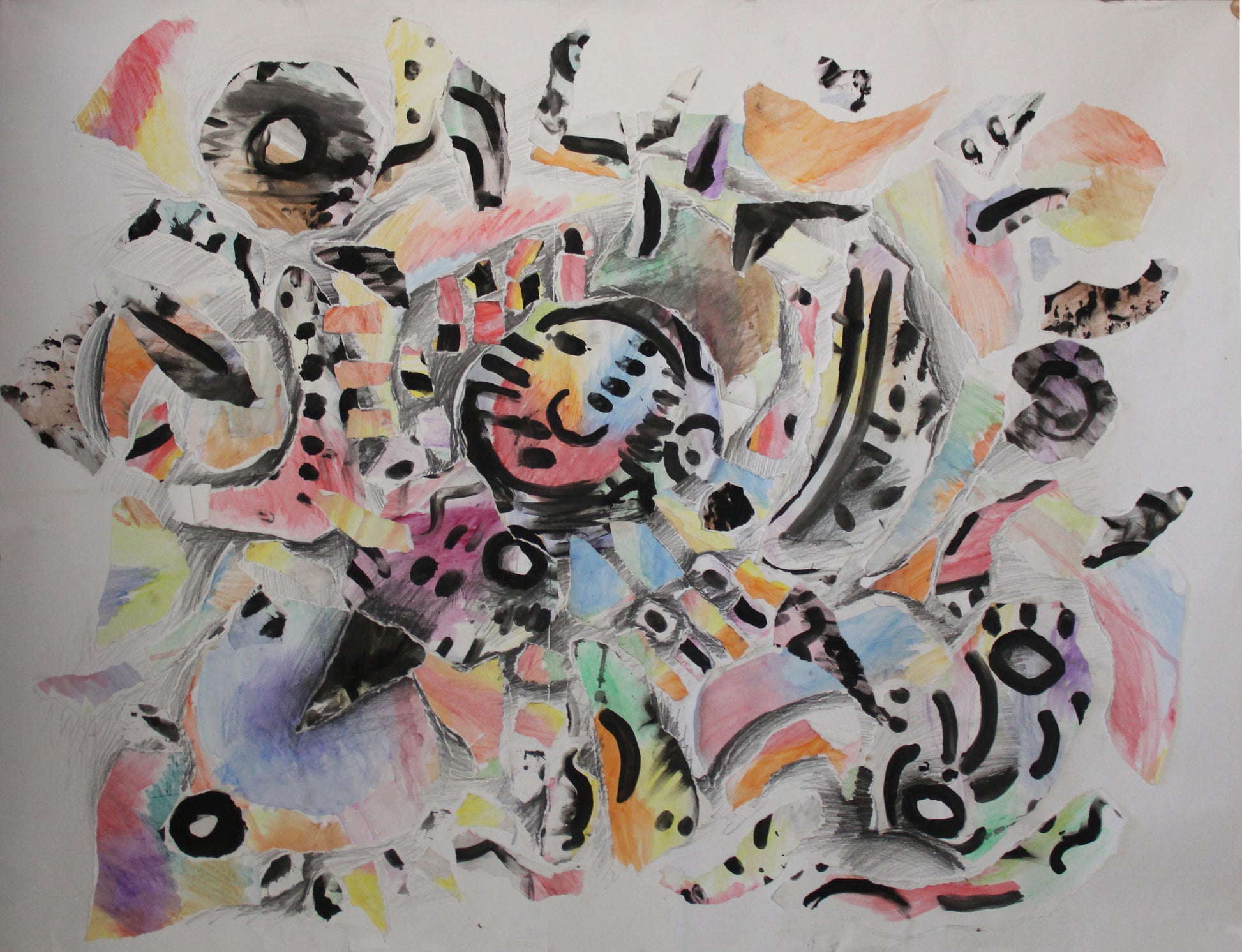 Abstrakt vytvorený s pomocou môjho mladšieho brata Benjamína. Zmiešané médiá (akryl, pastelky, koláž) na papieri, 109cm x 86cm.