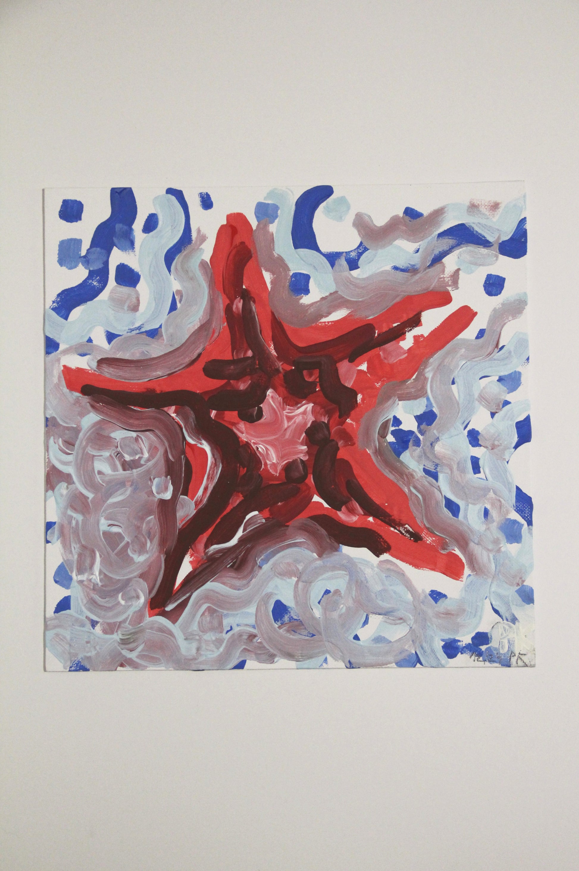Morská hviezda v rozbúrenom mori, akryl na tenkom plátne, 30cm x 30cm.